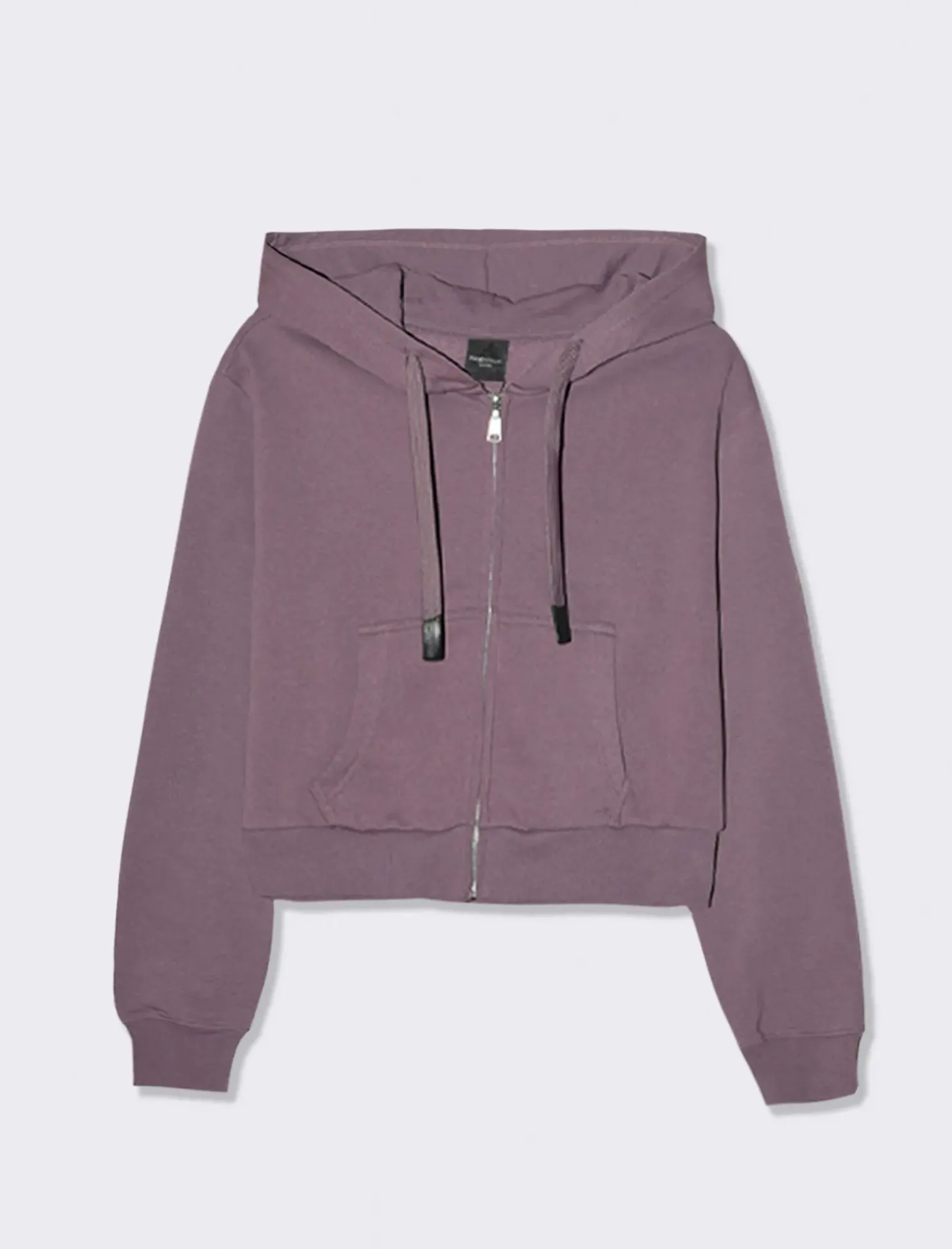 Felpa crop con cappuccio e chiusura a cerniera, perfetta per un look casual e alla moda. Realizzata con dettagli in tessuto a costina per un tocco di stile in più. Disponibile in una varietà di colori vivaci e trendy, ideale per completare il tuo outfit in ogni occasione. Il prodotto è di colore Viola malva