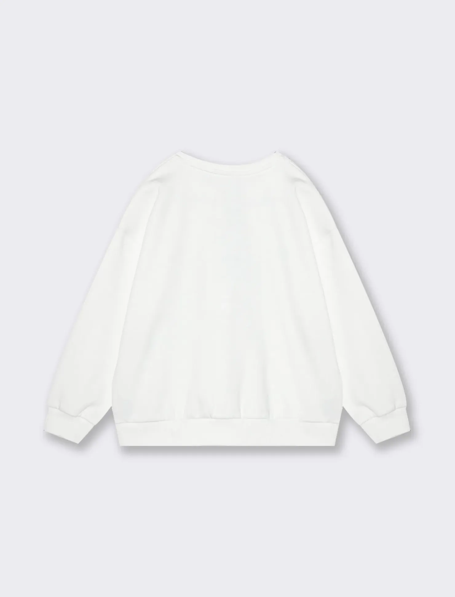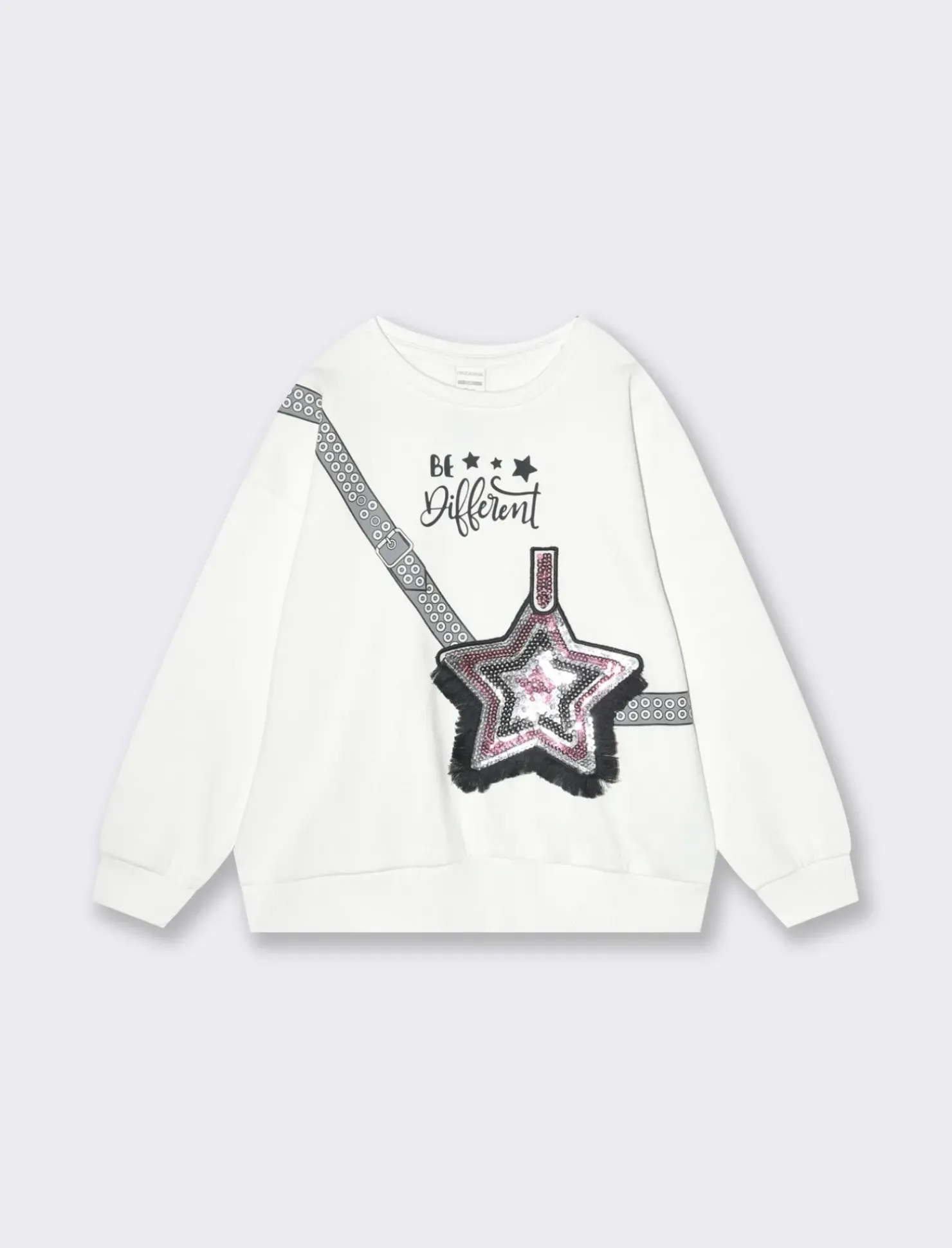 Felpa garzata in polycotone da bambina con vera borsa incorporata decorata con paillettes ricamate. Costina al fondo, fondo manica e girocollo. Il prodotto è di colore Bianco sporco