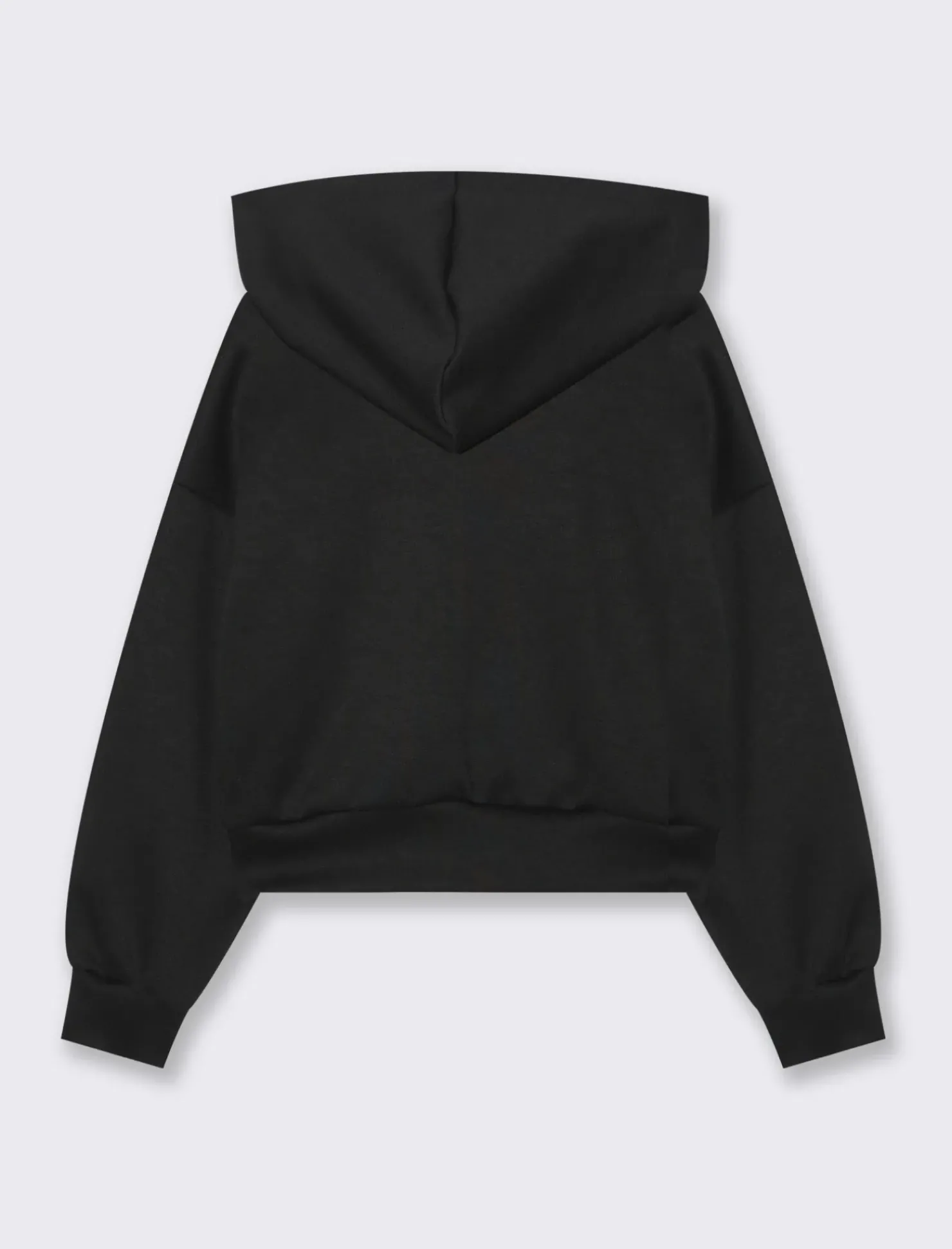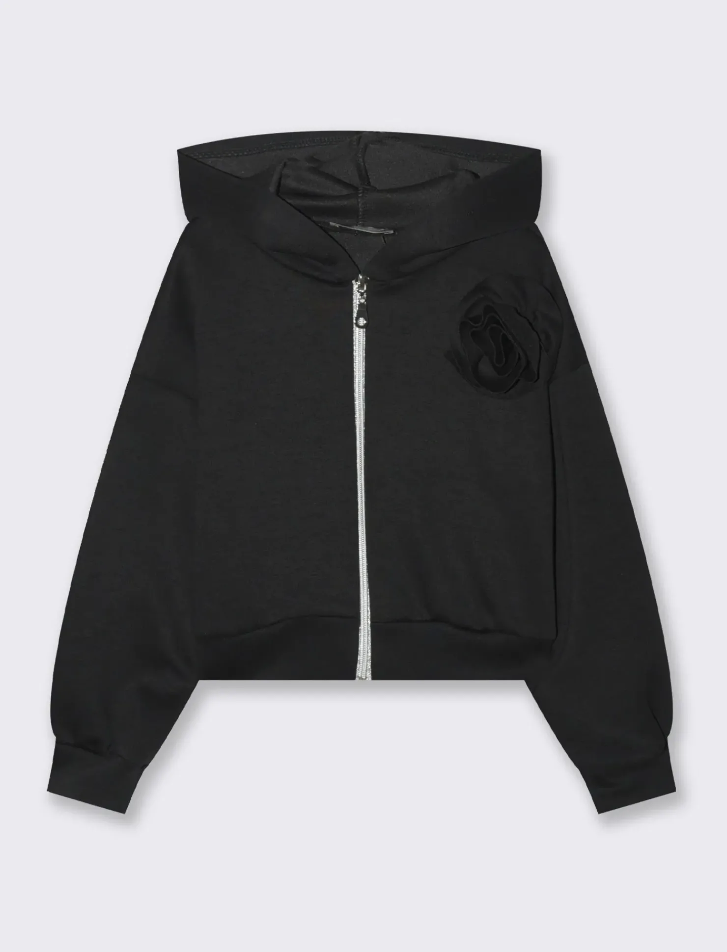Felpa da bambina realizzata in morbido cotone bioelastico, ideale per garantire comfort e libertà di movimento. Caratterizzata da una pratica zip frontale e un cappuccio avvolgente, è perfetta per le giornate più fresche. Il delizioso fiore cucito sul davanti aggiunge un tocco di stile e originalità, rendendo questo capo un must-have nel guardaroba delle piccole fashioniste. Un’ottima scelta per ogni occasione, dalla scuola al tempo libero. Il prodotto è di colore Nero