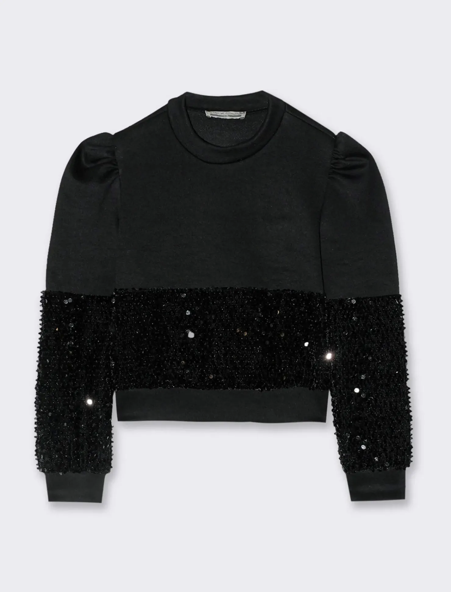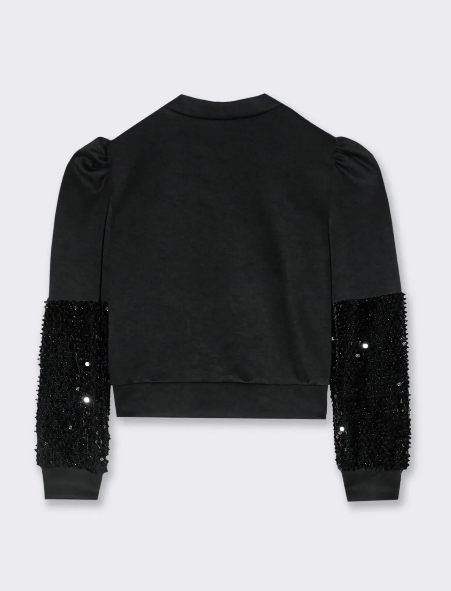 Felpa in scuba dalla vestibilità regular, modello mezzo collo con arriccio alle spalle. Arricchita da inserti in tessuto operato con paillettes reversibili in tono. Il prodotto è di colore Nero