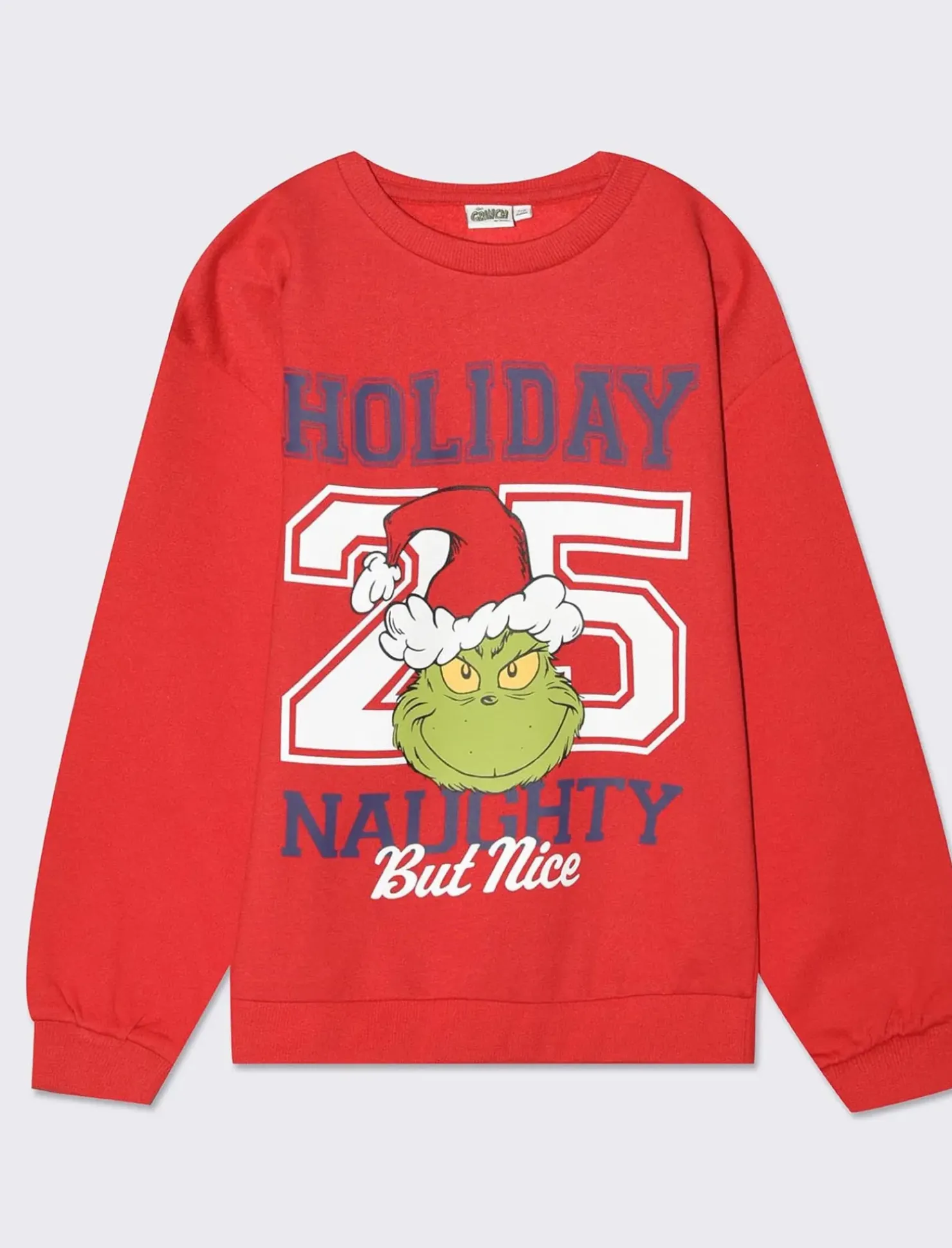 Felpa garzata da bambino, girocollo con stampa natalizia Grinch, perfetta per dare allegria alle feste natalizie. Il prodotto è di colore Rosso