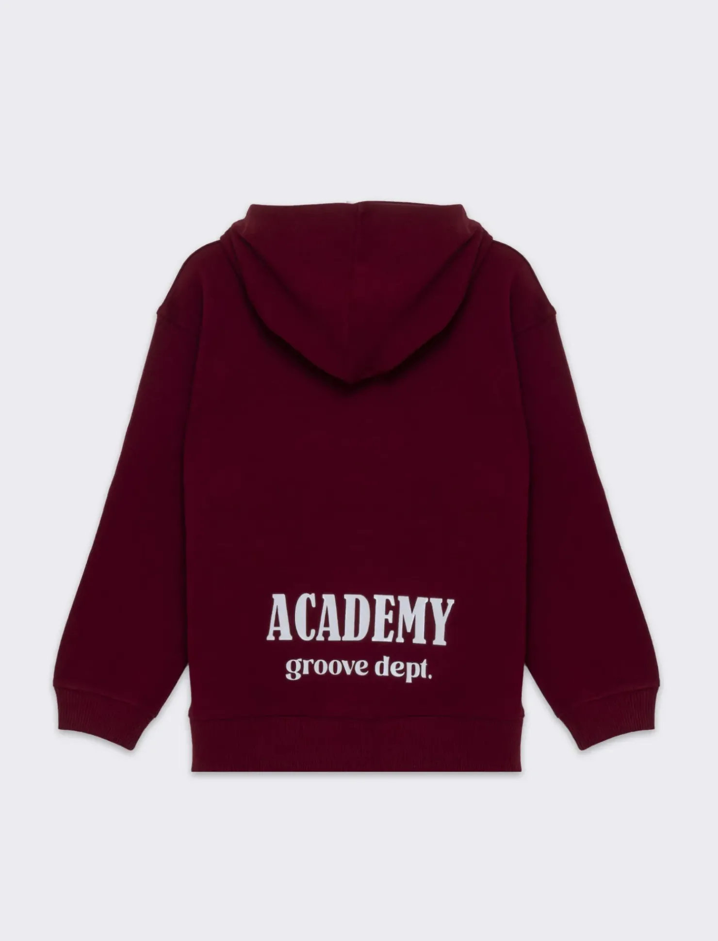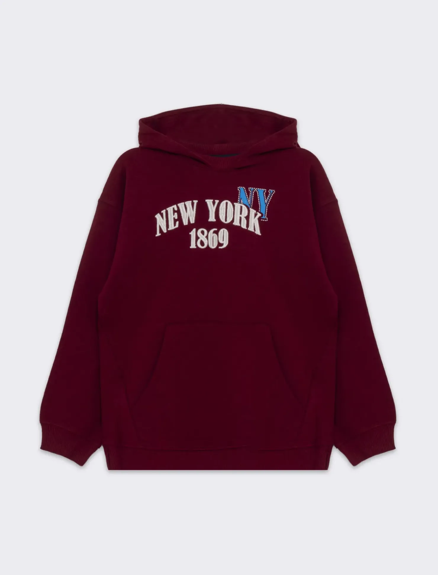 FELPA GARZATA CON CAPPUCCIO E FONDO ASIMMETRICO. LINEA OVER E RICAMO IN STILE COLLEGE PER UN GUSTO SPORTIVO. Il prodotto è di colore Bordeaux