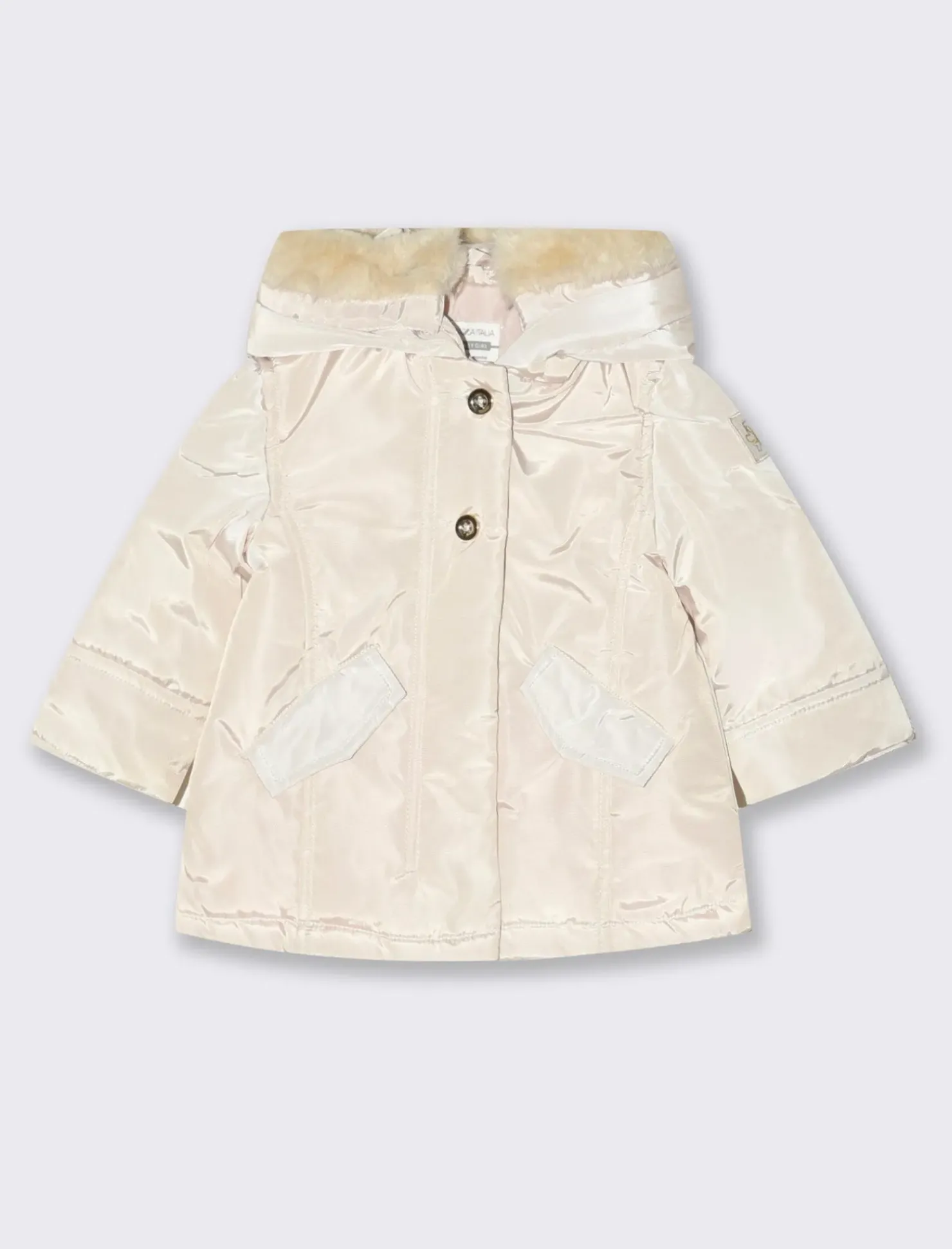 Giaccone lungo, perfetto per affrontare le giornate invernali più fredde con stile e comfort. Questo giaccone è realizzato in un tessuto resistente e isolante, che offre una protezione ottimale contro il freddo e il vento. Il cappuccio, foderato con una soffice pelliccia, aggiunge un ulteriore strato di calore e un tocco di eleganza. La pelliccia non solo mantiene la testa e le orecchie al caldo. Le tasche frontali sono ampie e pratiche,e la lunghezza del giaccone offre una copertura completa, proteggendo il tuo bambino nelle fredde giornate invernali.Il presente prodotto è conforme al rischio generico di sicurezza di cui allart.5 del Regolamento Europeo 988/2023. Il prodotto è di colore Beige