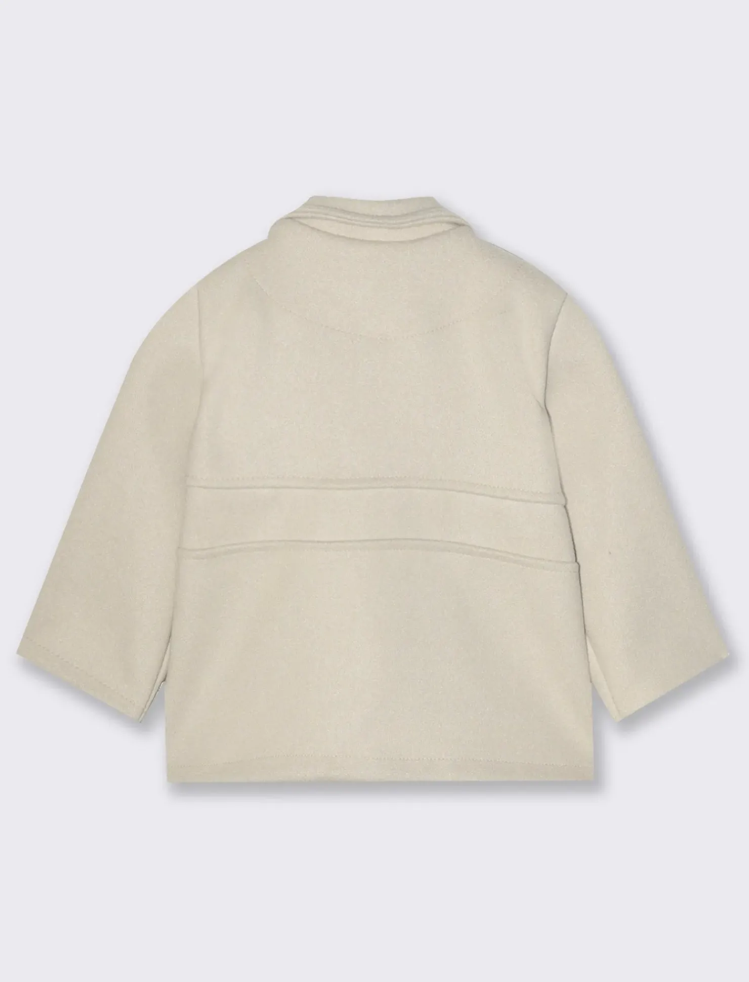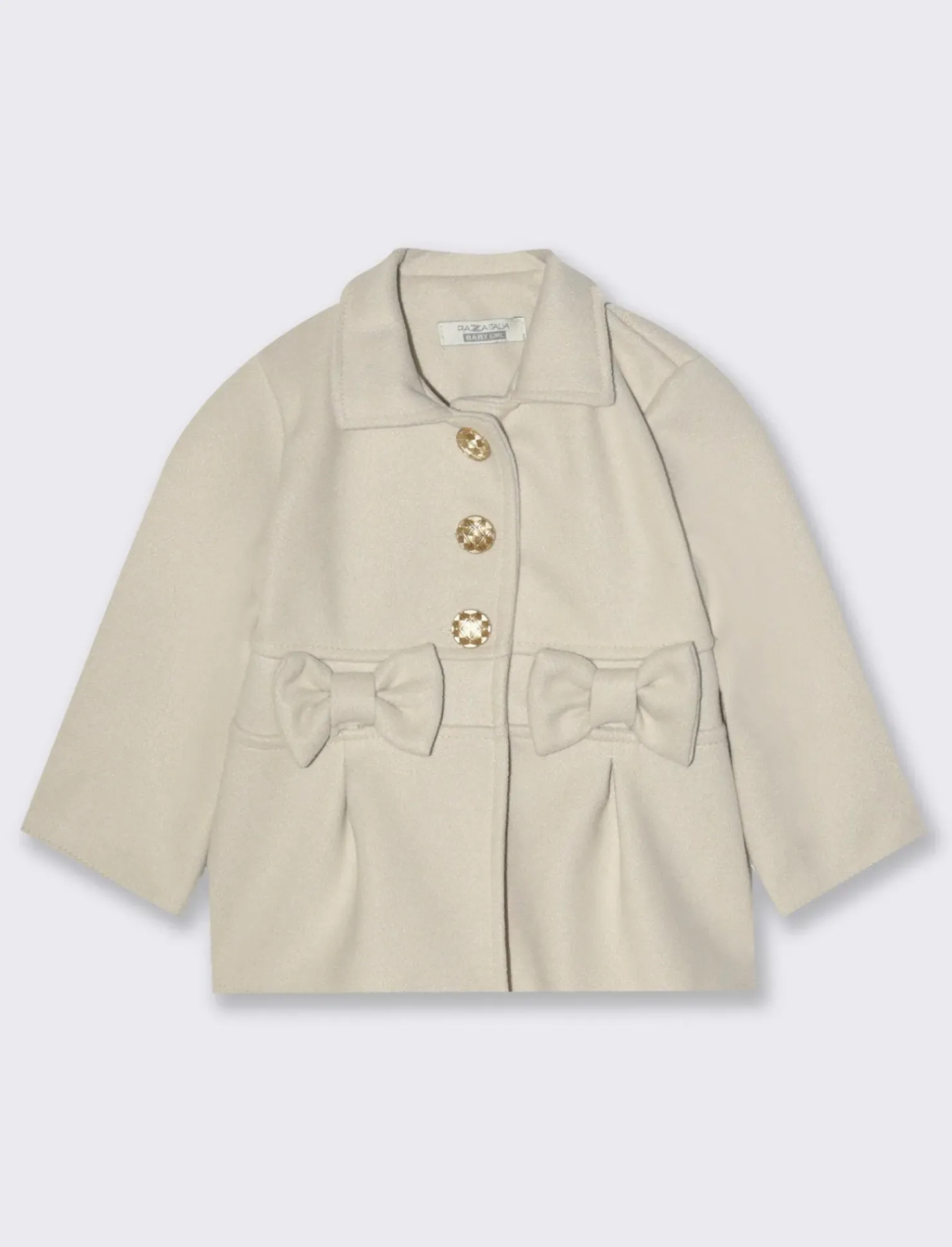Cappottino elegante da neonata in panno. Modello leggermente svasato con fiocchi decorativi e bottoni gioiello. Il prodotto è di colore Bianco panna