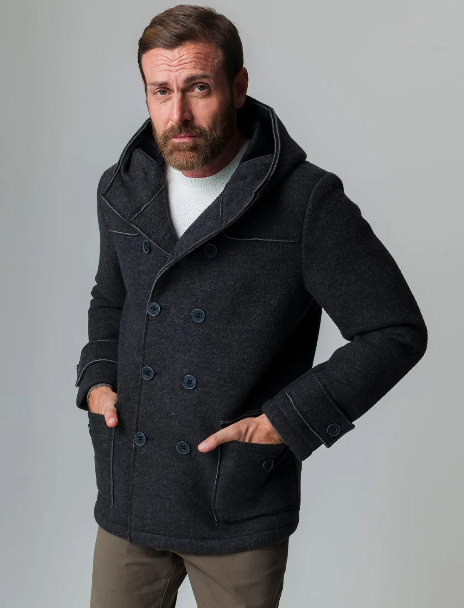 Giaccone doppiopetto pensato per l’uomo moderno, realizzato in un pregiato tessuto doppiato che garantisce calore e comfort. Il collo alto, abbinato a un cappuccio pratico, offre una protezione extra contro le intemperie. Le maniche lunghe assicurano una vestibilità perfetta, mentre le tasche a toppa con patta offrono spazio per gli oggetti essenziali. La chiusura frontale con abbottonatura a vista conferisce un tocco di eleganza, rendendolo ideale per ogni occasione. Il prodotto è di colore Grigio antracite