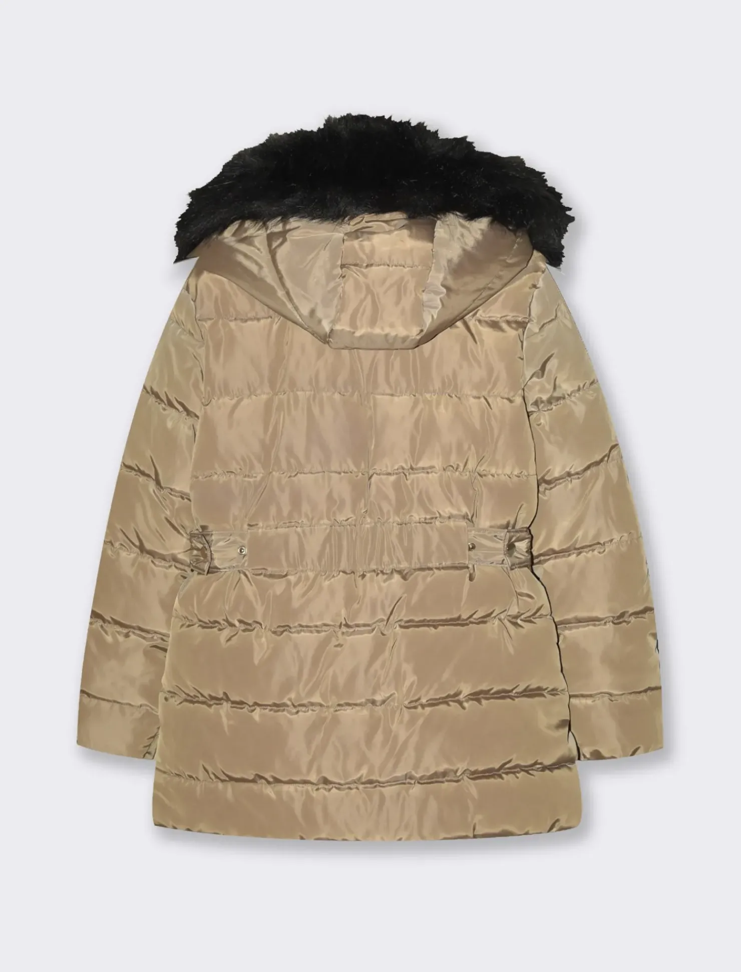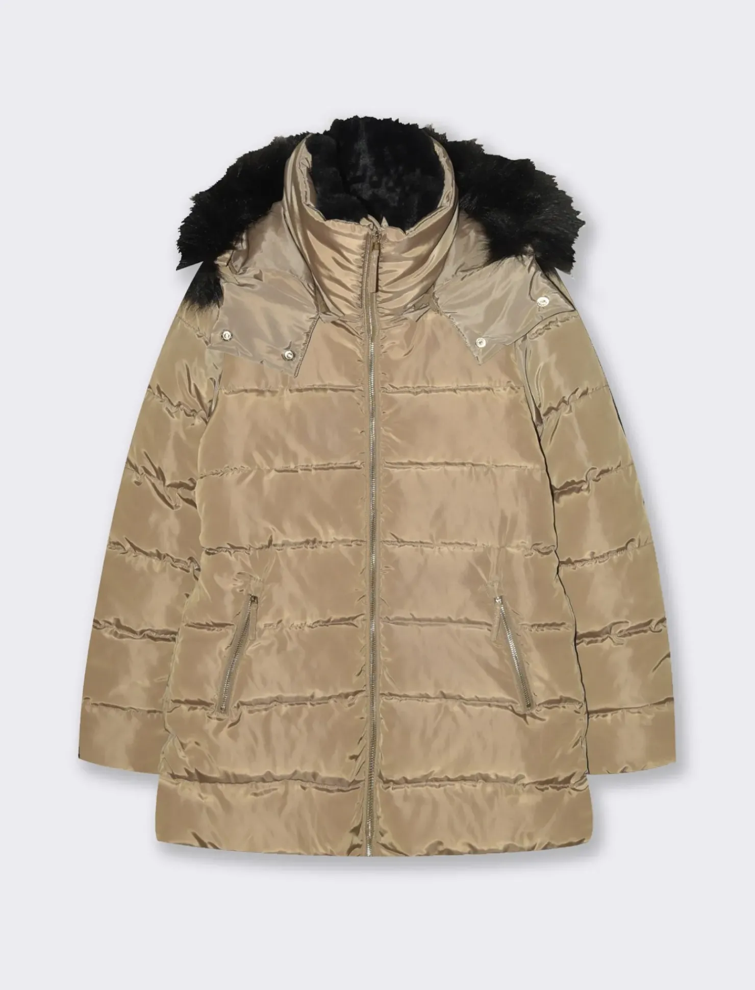 Giaccone imbottito per donna, ideale per affrontare le giornate più fredde con stile e confort. Dotato di cappuccio removibile con zip, questo capo offre versatilità e praticità. Il cappuccio presenta un raffinato tessuto effetto pelliccia, mentre il collo è rivestito internamente con lo stesso materiale, garantendo calore e morbidezza. La cintura elastica in vita valorizza la silhouette, mentre le tasche anteriori con bottoni a pressione offrono spazio per piccoli oggetti. Un must-have per un look moderno e accogliente. Il prodotto è di colore Cammello