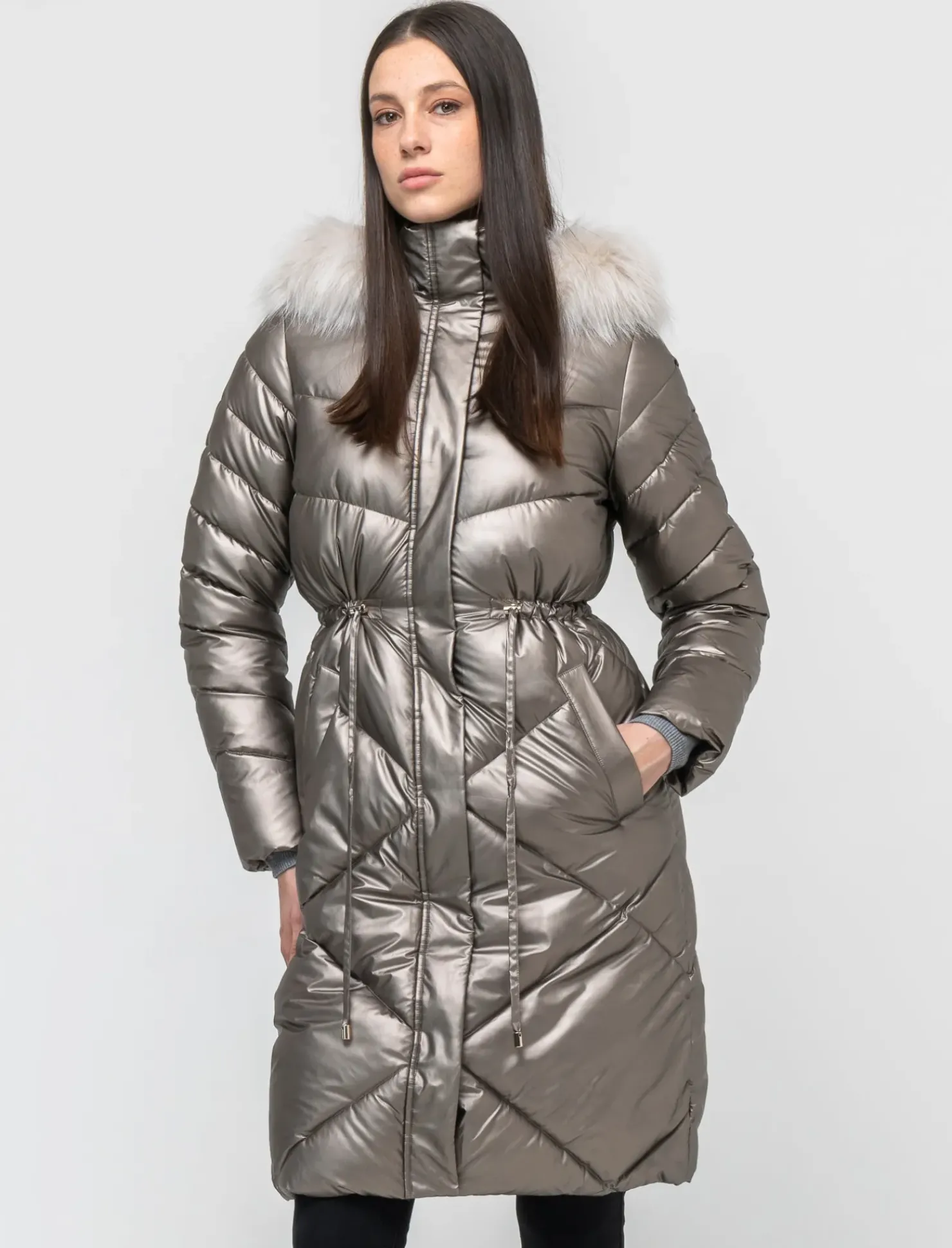 Il giaccone lungo con cappuccio per donna è un capo versatile e di tendenza, perfetto per affrontare le giornate più fredde con stile. Il bordo in finta pelliccia removibile aggiunge un tocco di eleganza e comfort, permettendo di personalizzare il look. La chiusura a zip garantisce praticità, mentre la culisse in vita permette di esaltare la silhouette, creando una vestibilità impeccabile. Il prodotto è di colore Argento