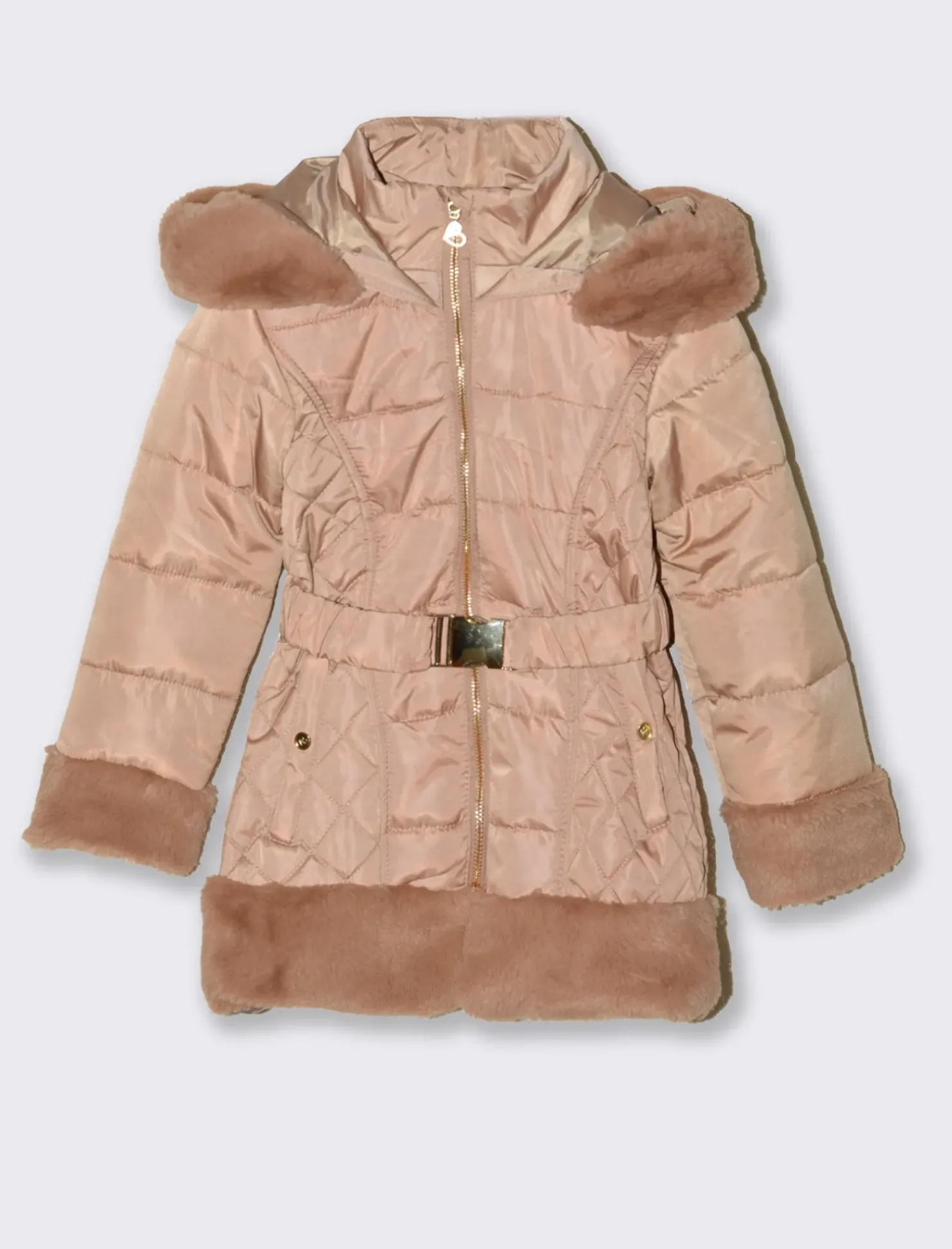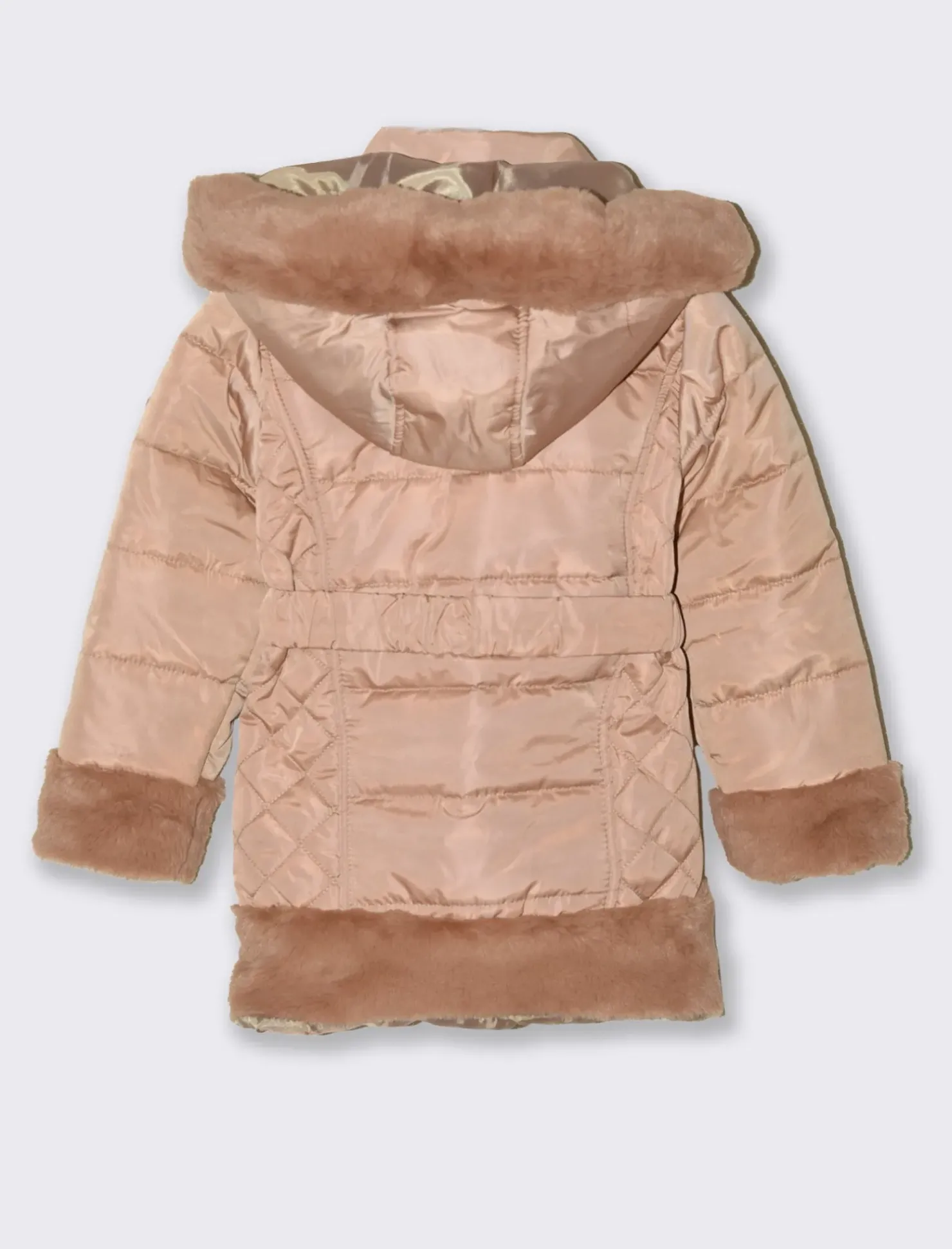 Piumino lungo da bambina con cappuccio e bordi in finta pelliccia al fondo e alle maniche.Cintura elastica in vita e accessori metallici color oro. Il prodotto è di colore Marrone