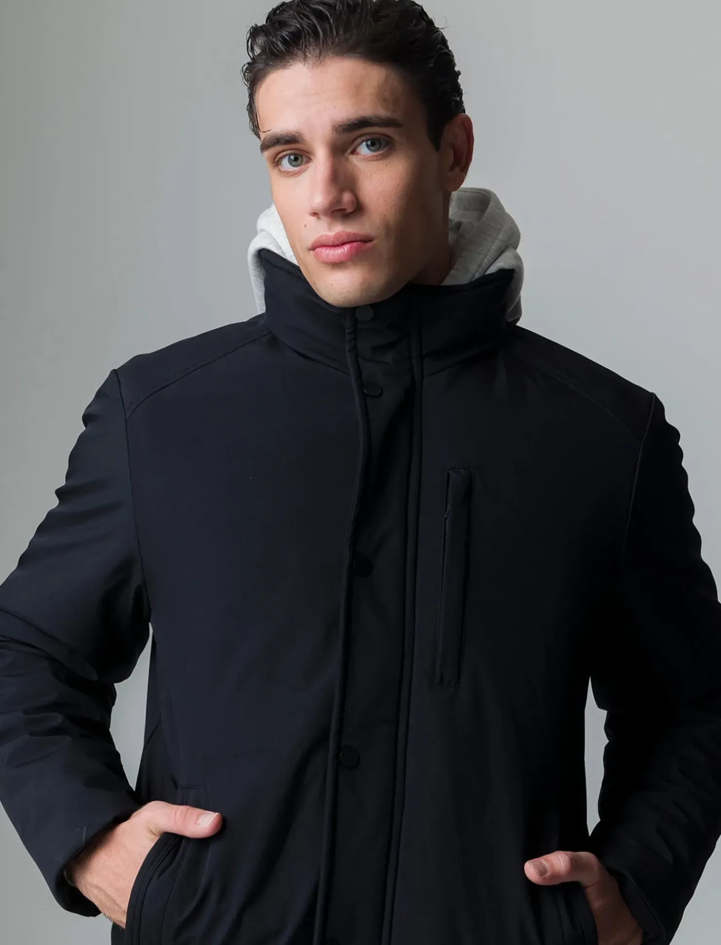 Giaccone con imbottitura interna, progettato per offrire comfort e protezione anche nelle giornate più fredde. Realizzato in tessuto tecnico resistente, presenta un collo alto che garantisce calore e una vestibilità perfetta. Le maniche lunghe e le tasche con cerniera sul davanti offrono praticità e sicurezza per i tuoi oggetti personali. La chiusura frontale, con bottoni automatici e zip nascosta, unisce funzionalità e stile, rendendo questo giaccone un elemento essenziale nel guardaroba maschile. Il prodotto è di colore Nero