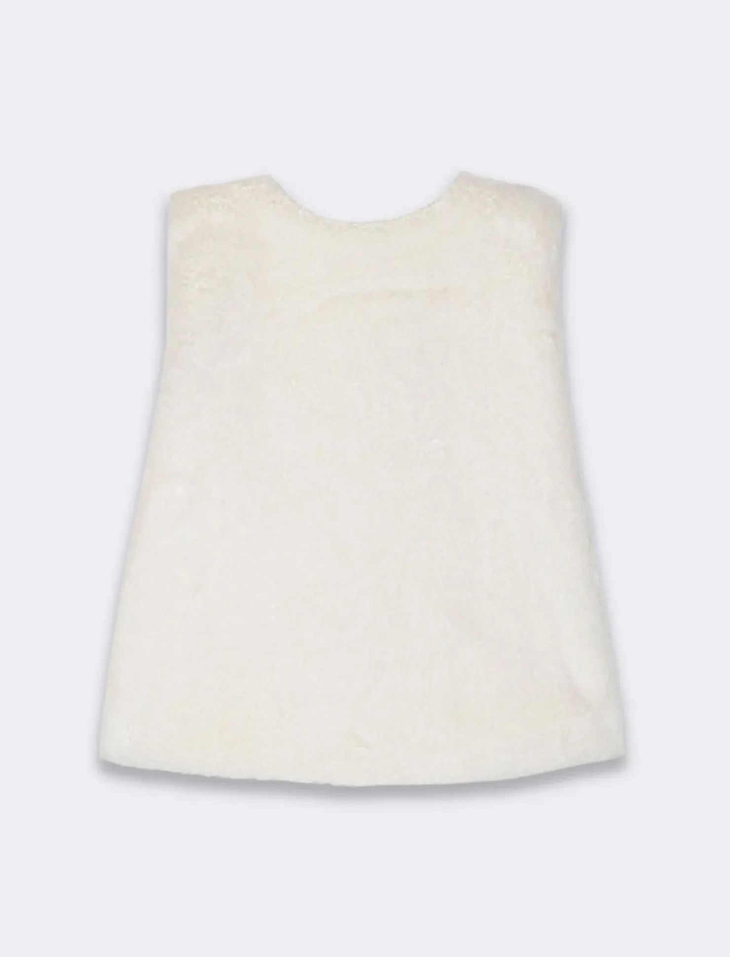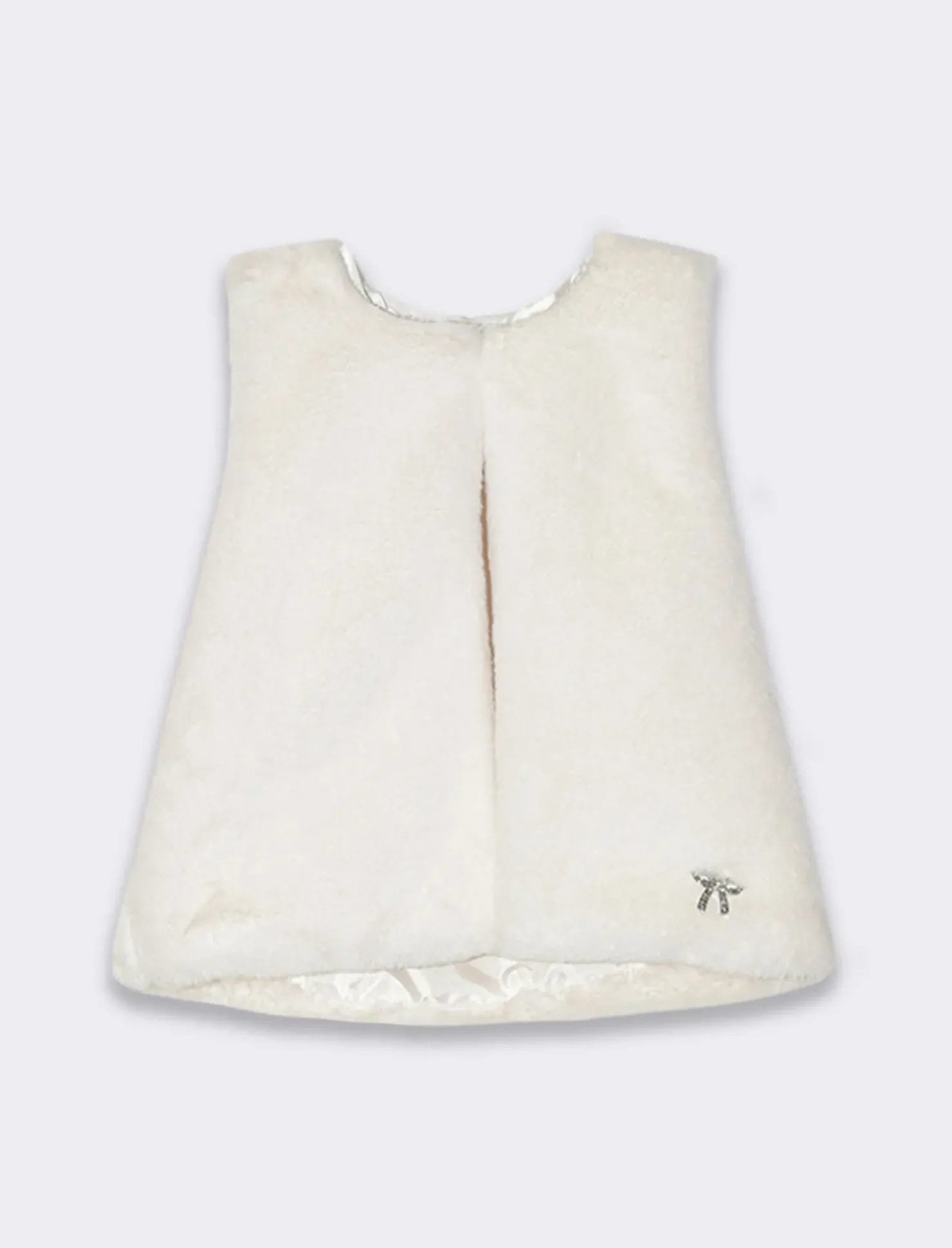 Gilet da neonata in finta pelliccia, soffice e morbida.Fodera interna. Charm con strass applicato al fondo. Il prodotto è di colore Bianco panna