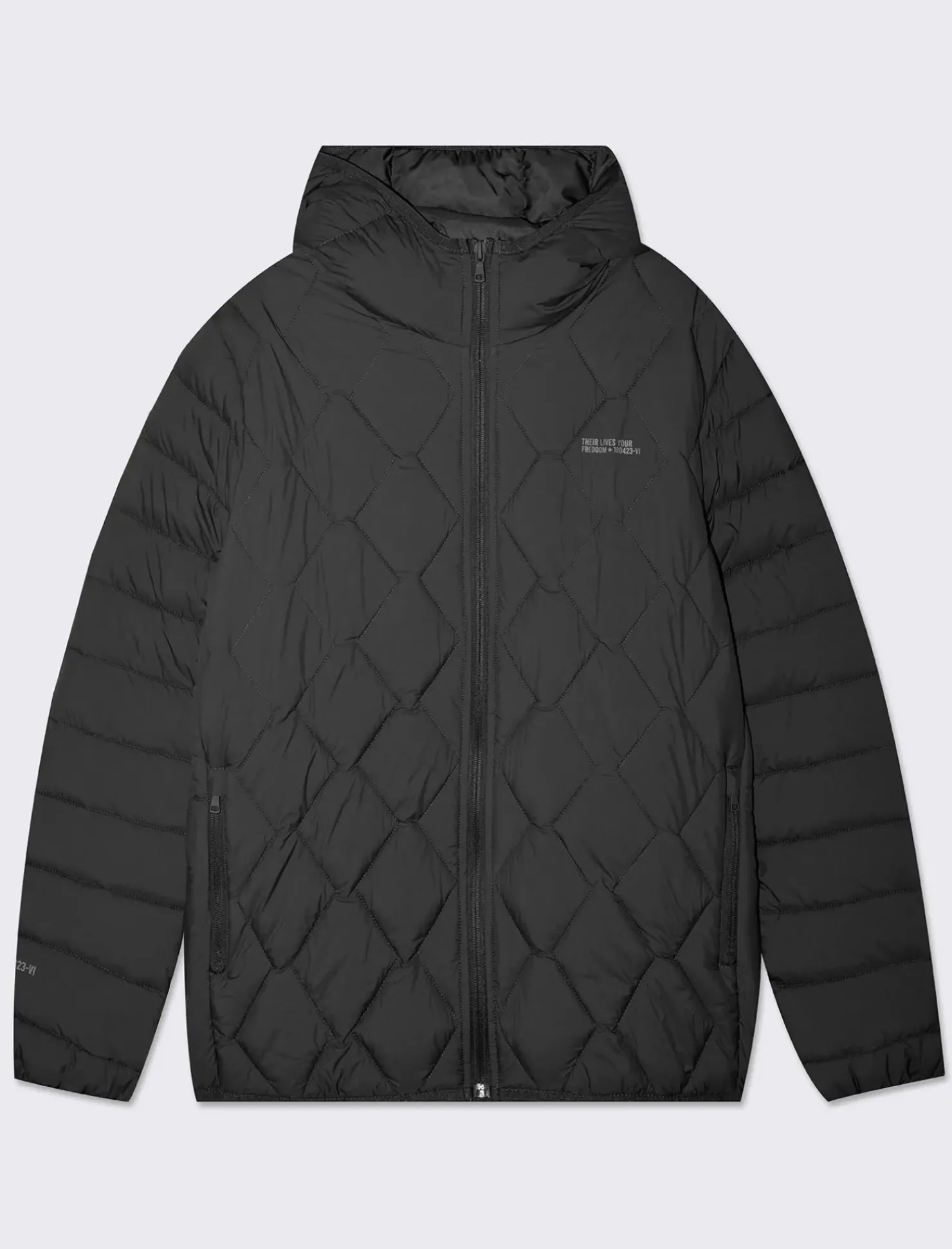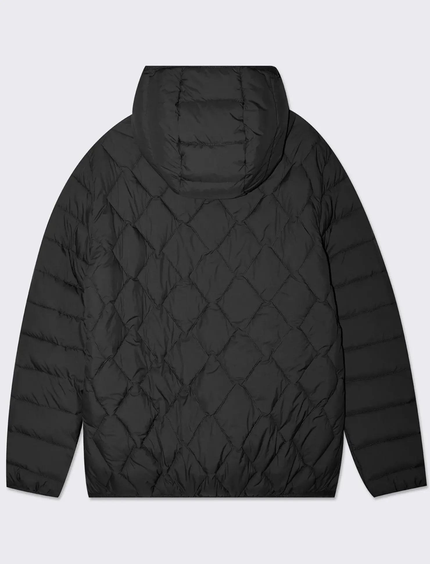 Giubbotto piumino con cappuccio per uomo. Realizzato in resistente poliammide, è perfetto per affrontare le giornate più fredde con stile e comfort. Il collo alto e il cappuccio offrono ulteriore protezione dal vento e dal freddo, mentre le tasche con chiusura a cerniera sui fianchi permettono di tenere al sicuro gli oggetti personali. La stampa sul davanti aggiunge un tocco di originalità. Il prodotto è di colore Nero