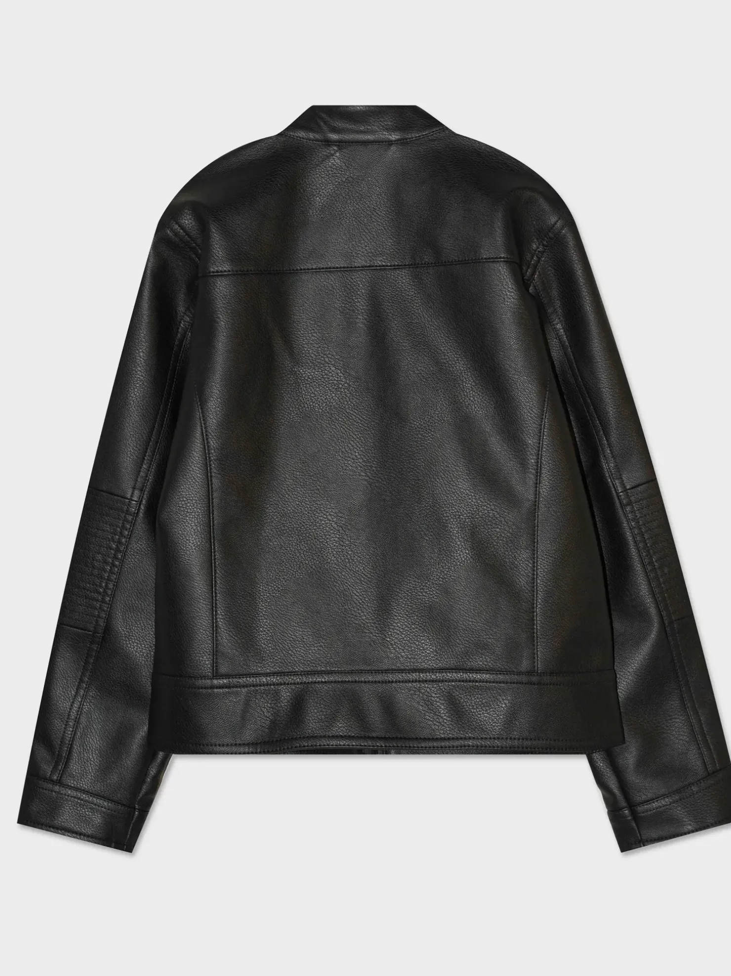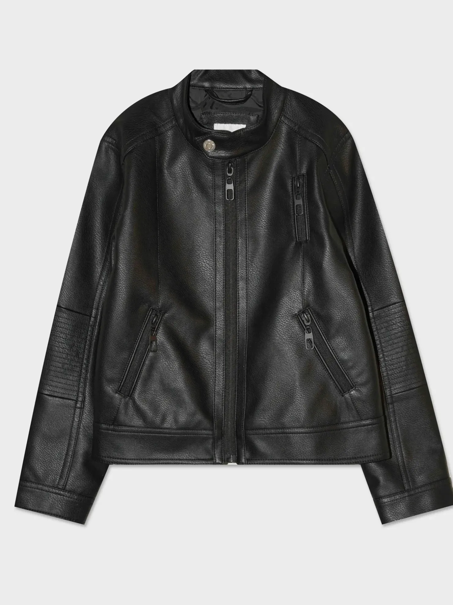 Giubbotto in finta pelle per bambino, perfetto per un look trendy e alla moda. Con apertura frontale con zip e tasche frontali con zip, è comodo e pratico da indossare. Il collo con faschetta e bottone a pressione aggiunge un tocco di stile in più. Ideale per completare ogni outfit con un tocco di personalità. Il prodotto è di colore Nero