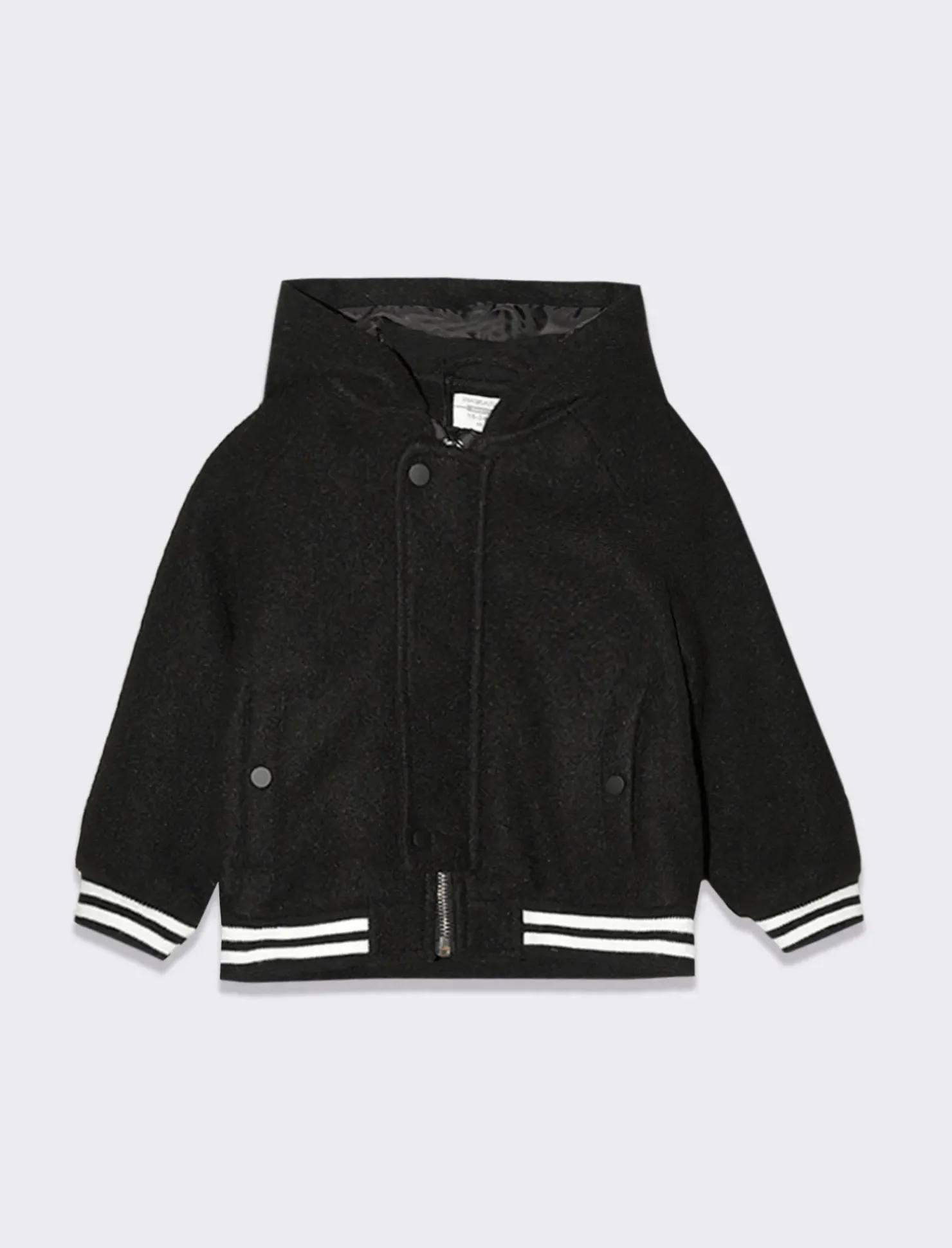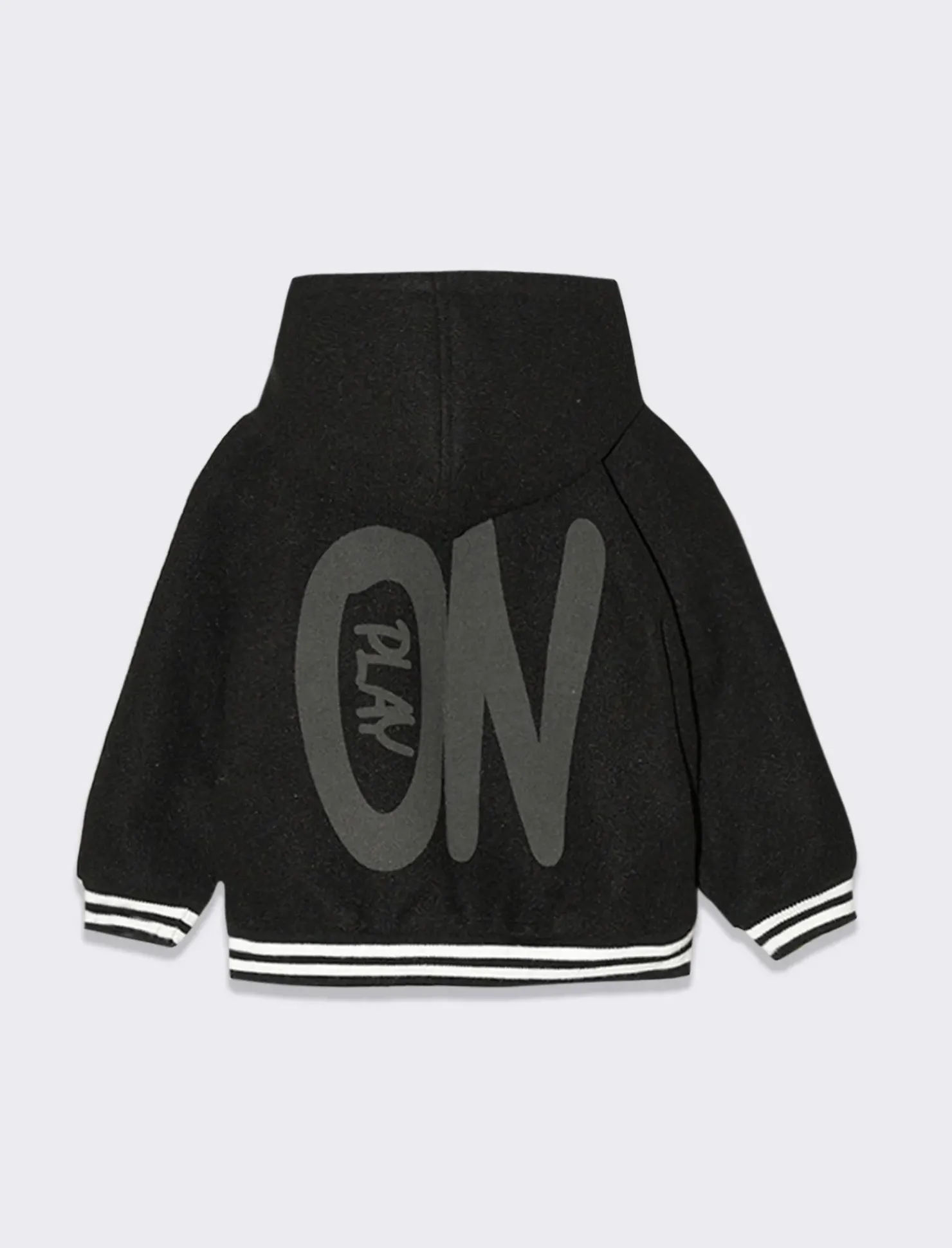 Giubbotto in panno per neonato con cappuccio e costine rigate, ideale per completare gli outfits più ricercati. Caratterizzato da una grande stampa sul retro e chiusura con zip e bottoni, questo capo è perfetto per tenere al caldo i più piccoli con stile e comfort. Il prodotto è di colore Nero