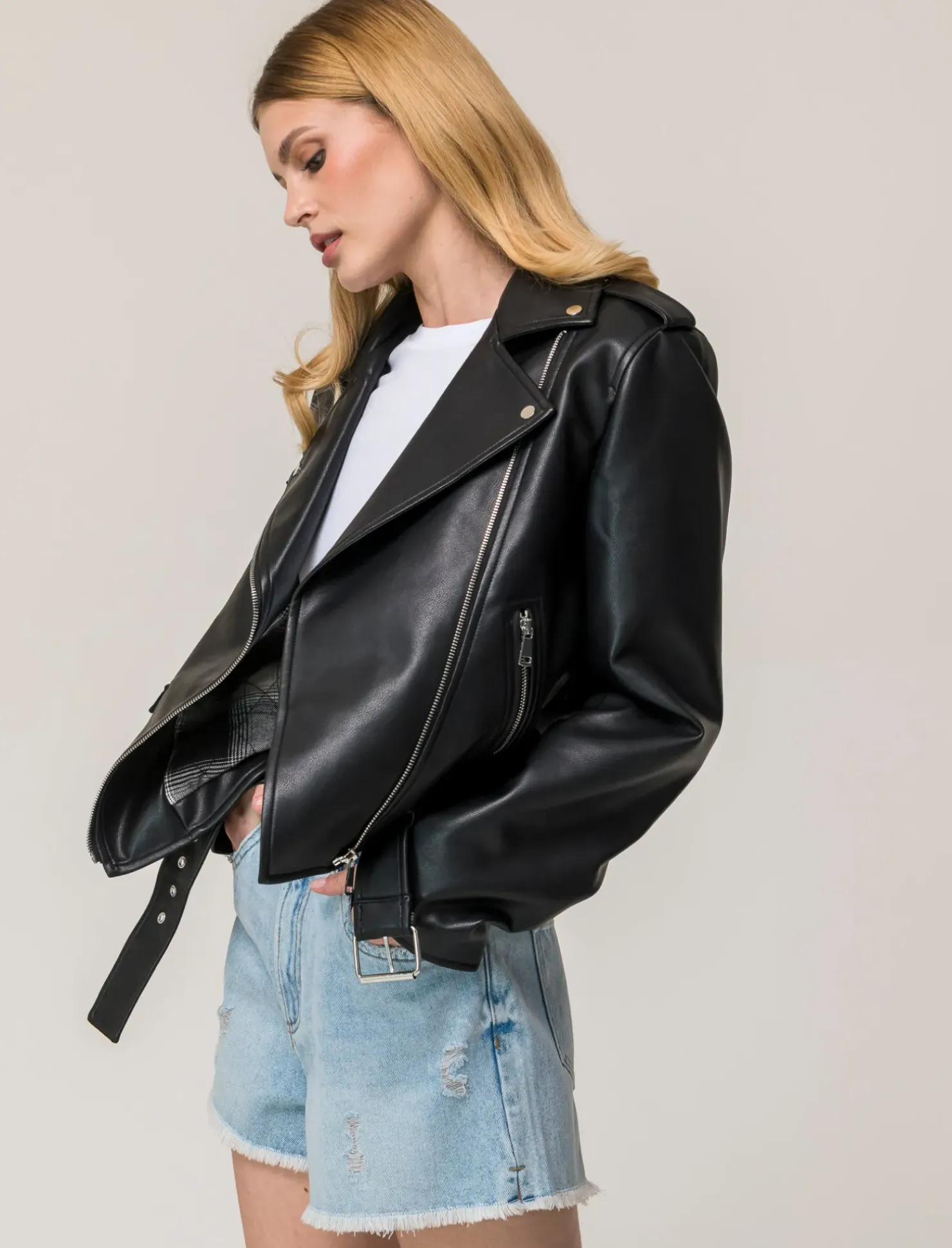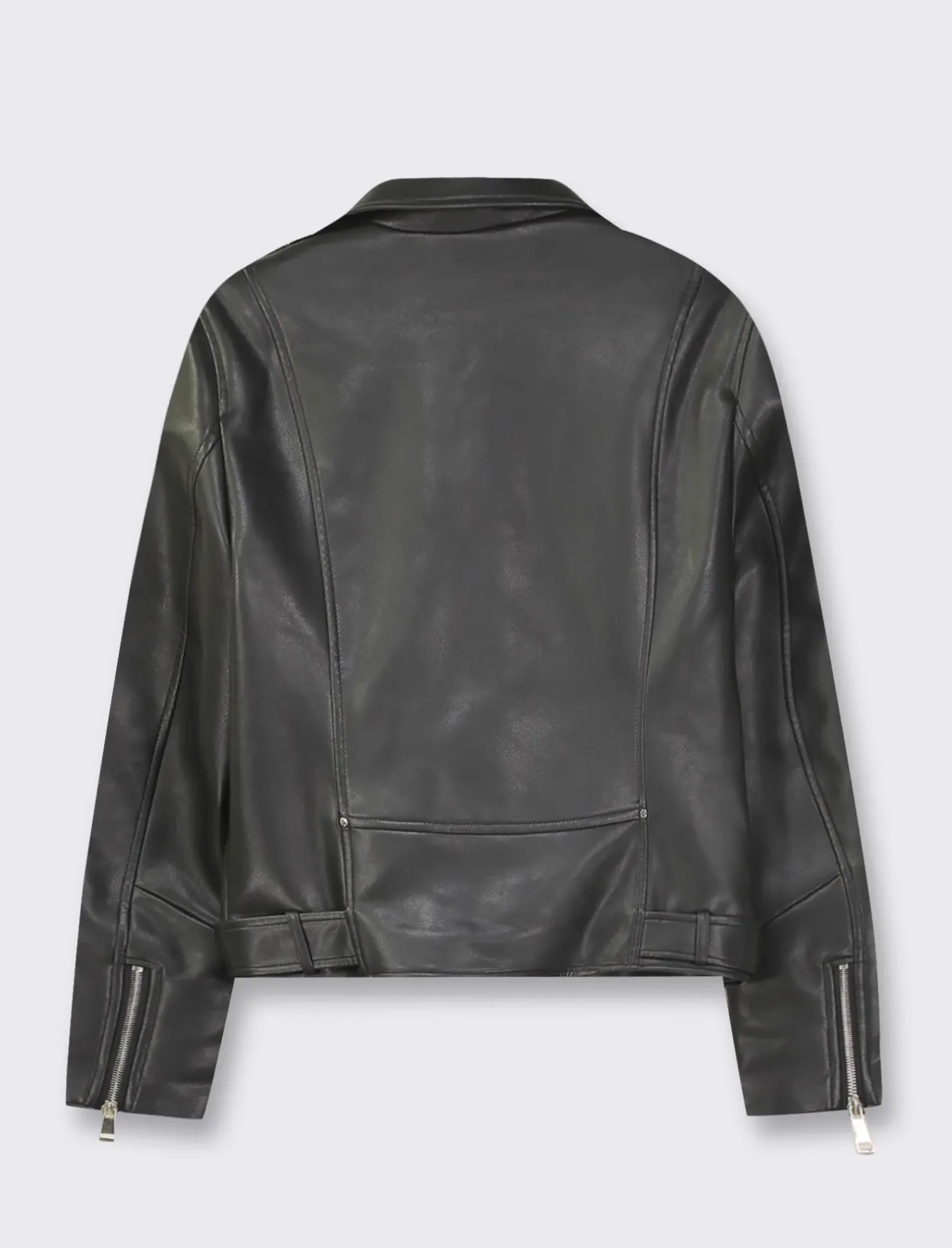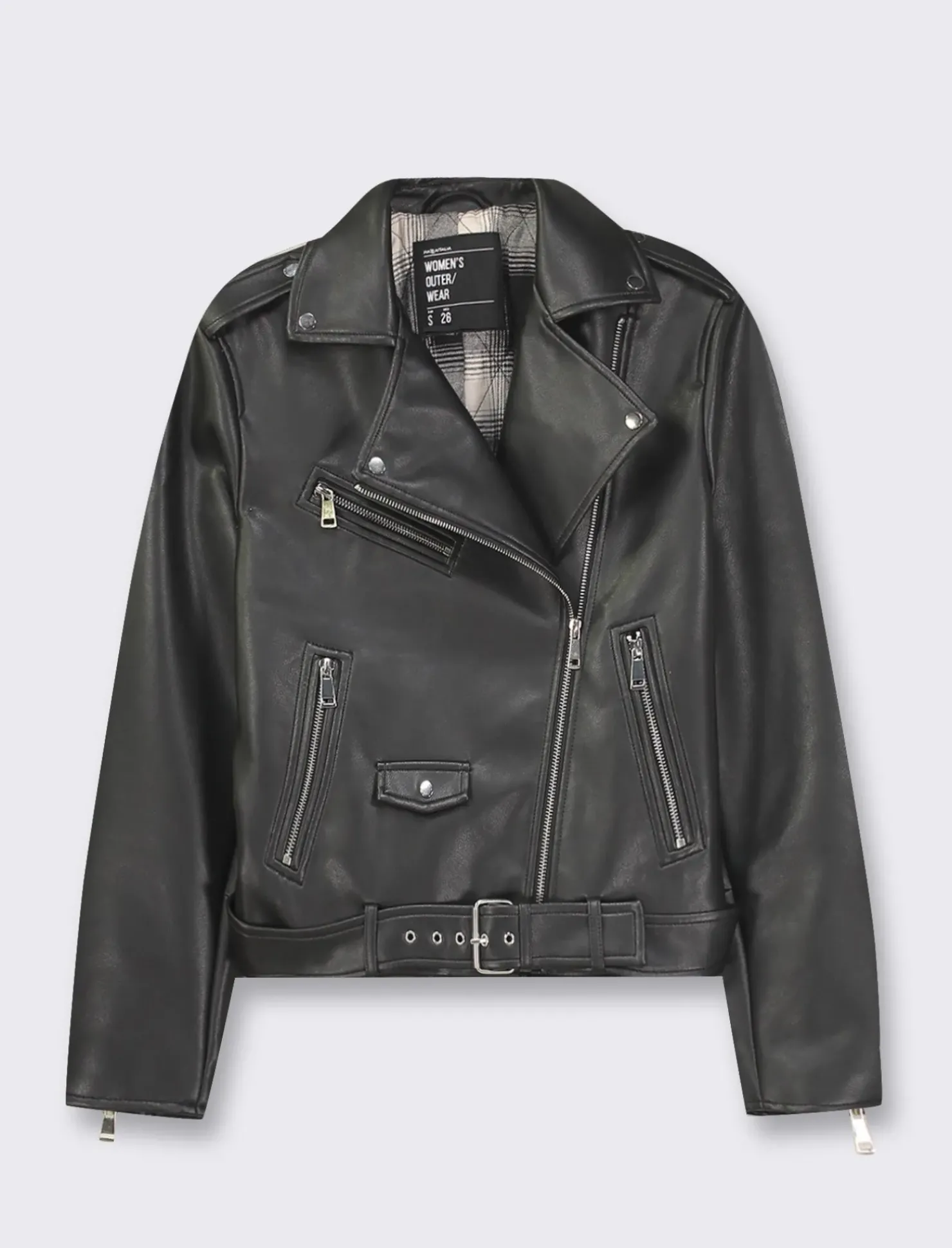 Giubbotto modello biker donna dal design trendy e versatile. Realizzato in morbido tessuto finta pelle, garantisce comfort e stile in ogni occasione. La vestibilità regular si adatta perfettamente alla silhouette femminile, mentre i dettagli metallici sulle maniche e sui rever conferiscono un tocco di originalità. Il prodotto è di colore Nero