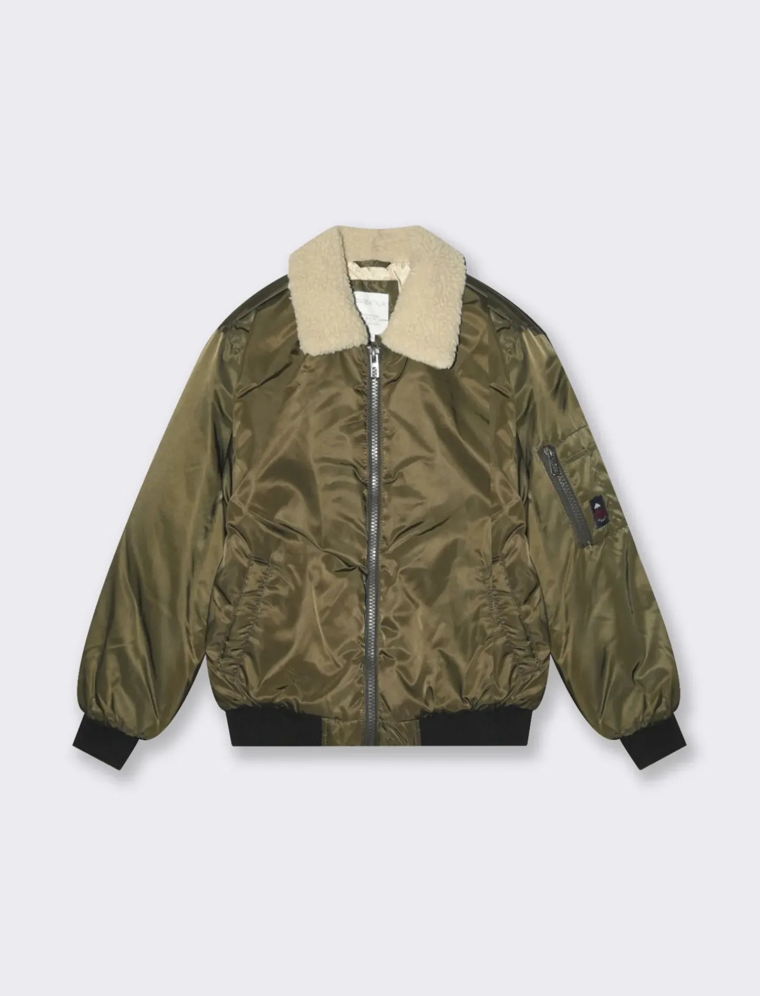 Giubbotto da bambino modello bomber con collo in finta pelliccia e taschino sulla manica. Ideale per il tempo libero. Il prodotto è di colore Verde militare