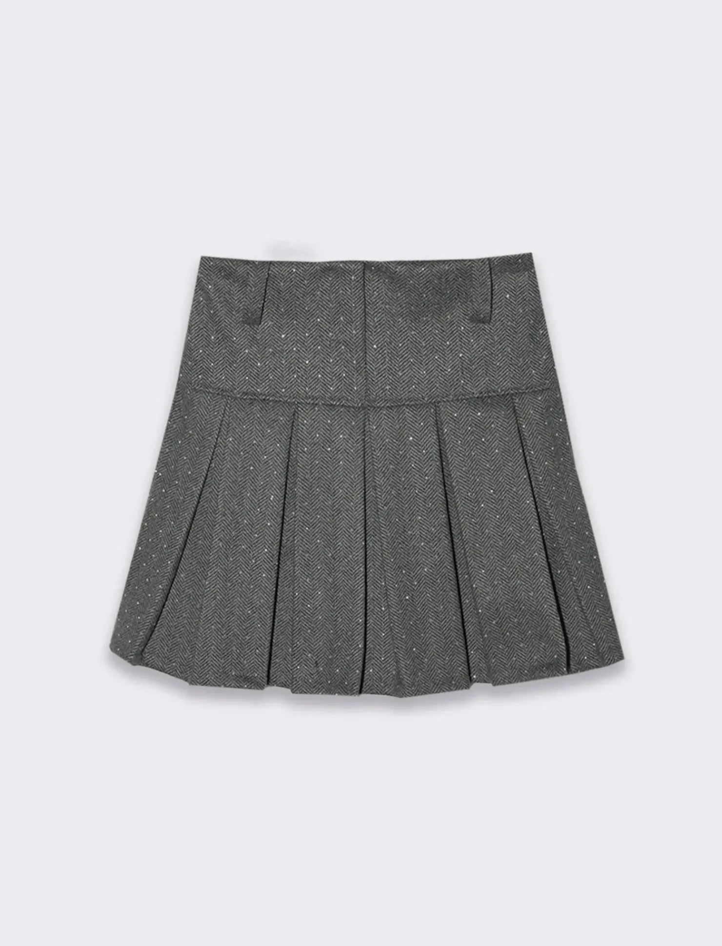 Gonna in tessuto spigato e borchie applicate decorative. Elastico in vita sul dietro e fintone decorativo sul davanti. Il prodotto è di colore Fantasia