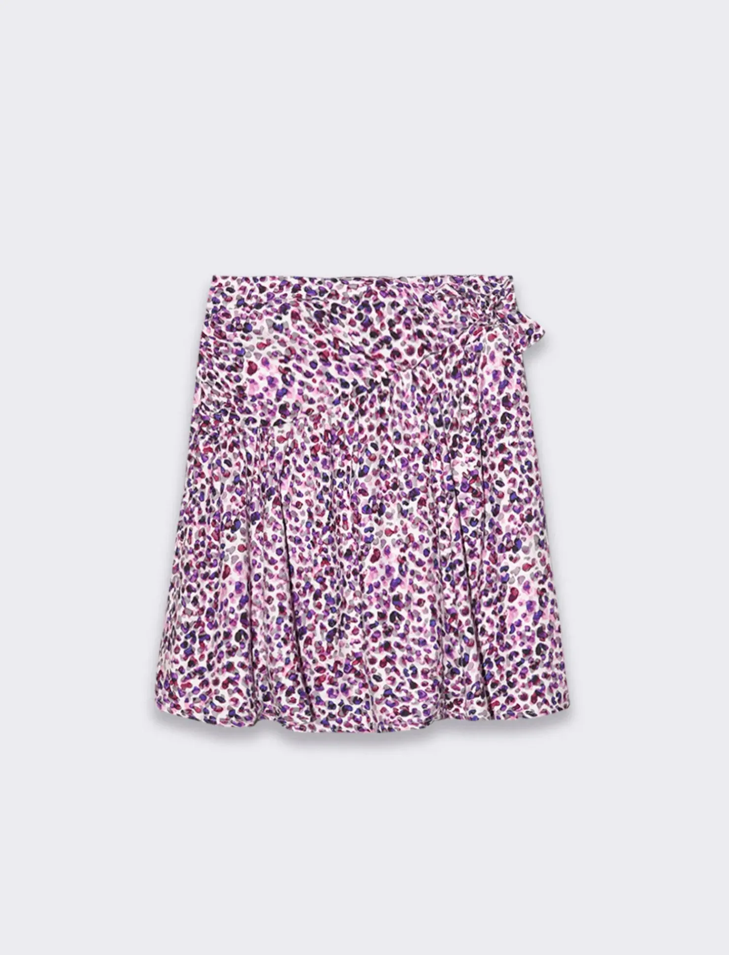 Gonna stampata elegante per bambina realizzata in morbida viscosa, con un taglio asimmetrico che conferisce un tocco di originalità. Il dettaglio del nodo sul davanti aggiunge un tocco di grazia e femminilità. Con elastico inserito sul retro per garantire il massimo comfort durante il gioco e le attività quotidiane. Il prodotto è di colore Viola