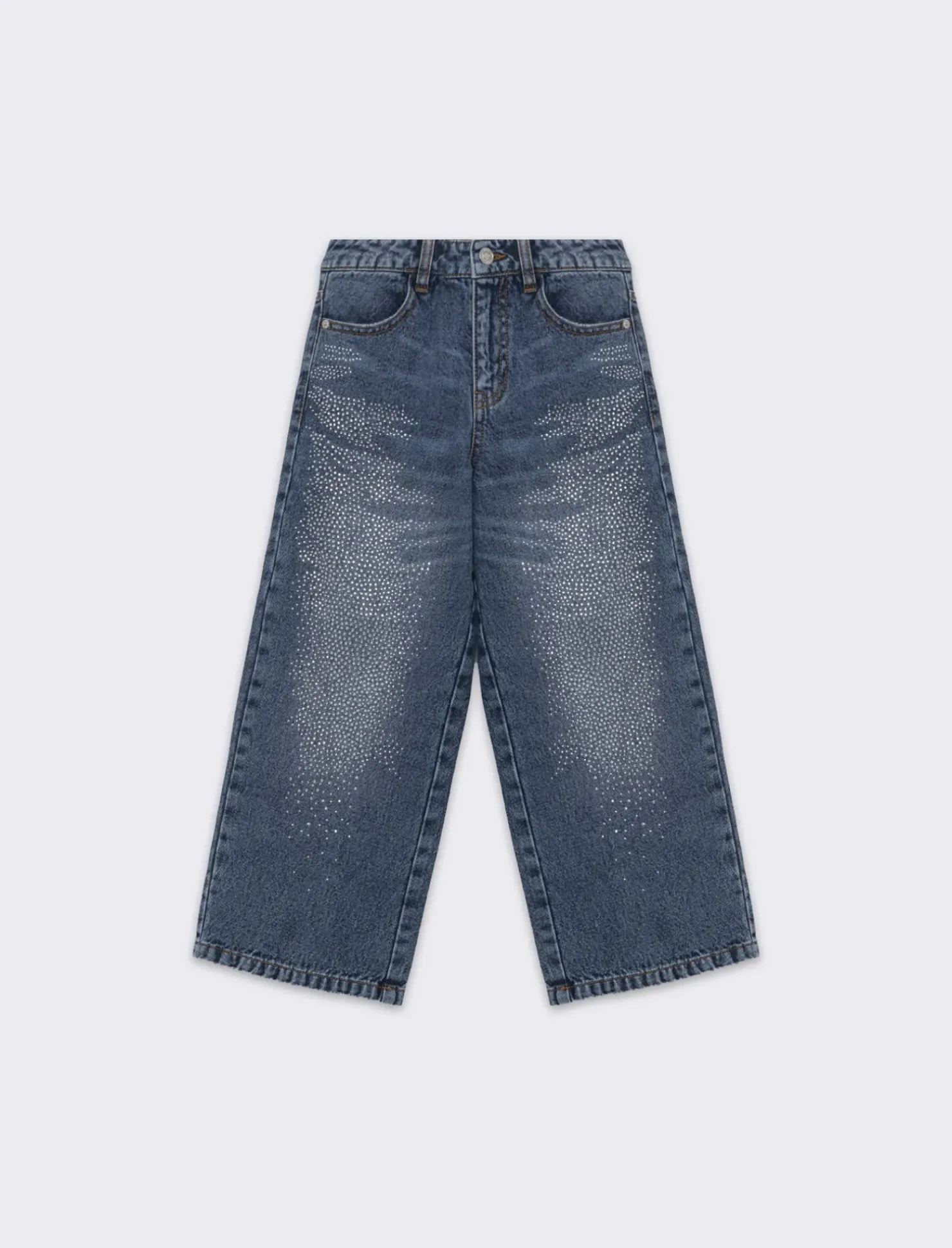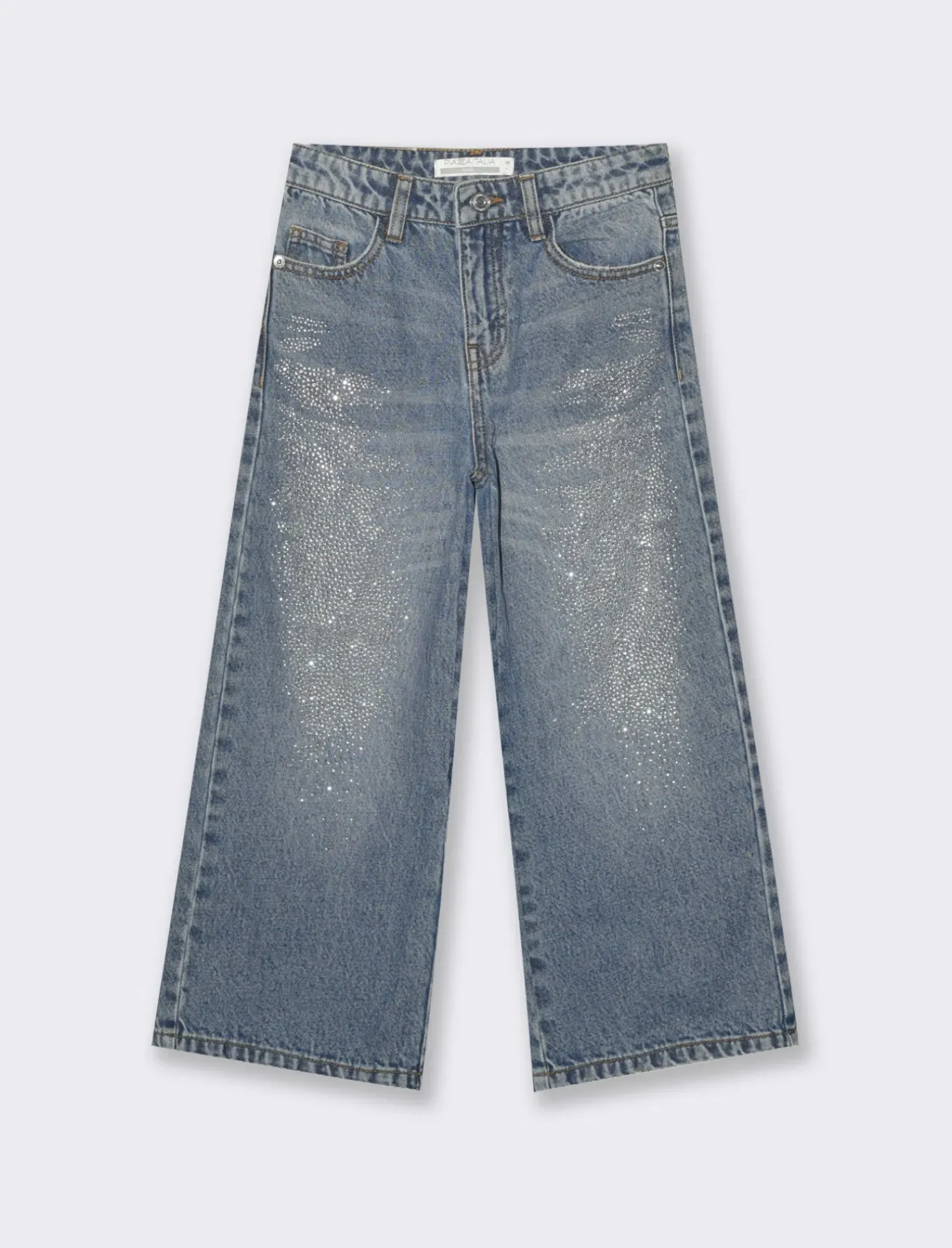 Denim 5 tasche da bambina con strass sul davanti. Vestibilità culotte e lunghezza con la caviglia scoperta. Il prodotto è di colore Denim