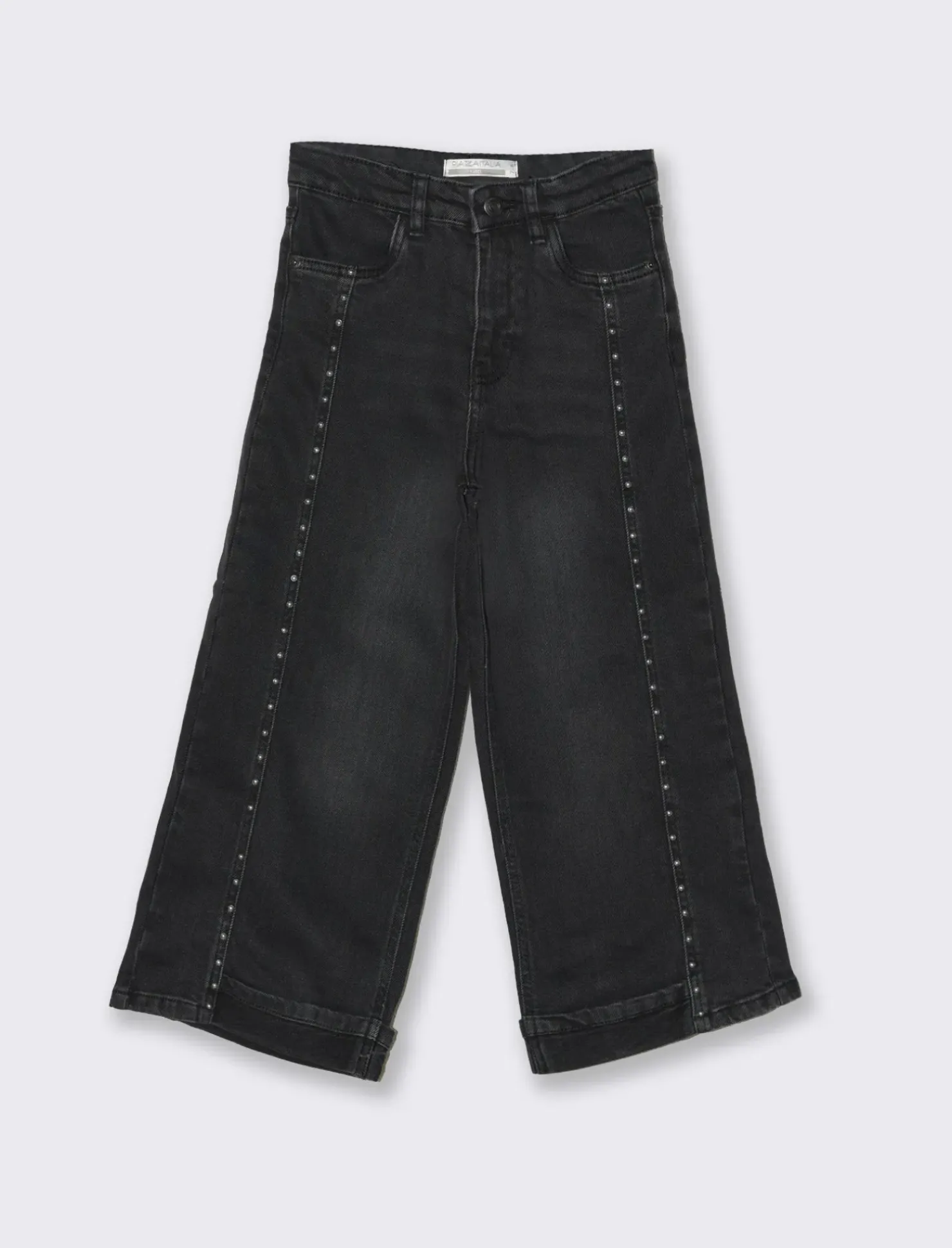 Jeans nero da bambina con gamba larga con borchie e piegone sul fondo Il prodotto è di colore Nero