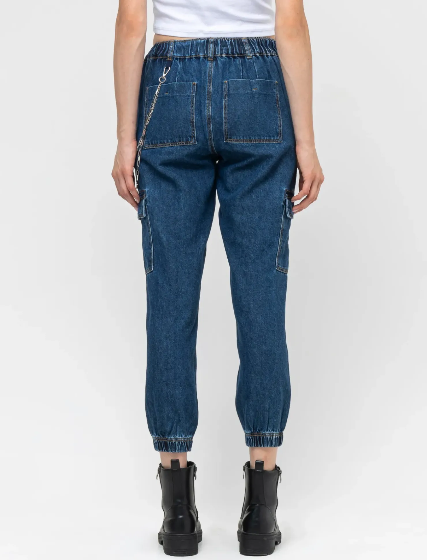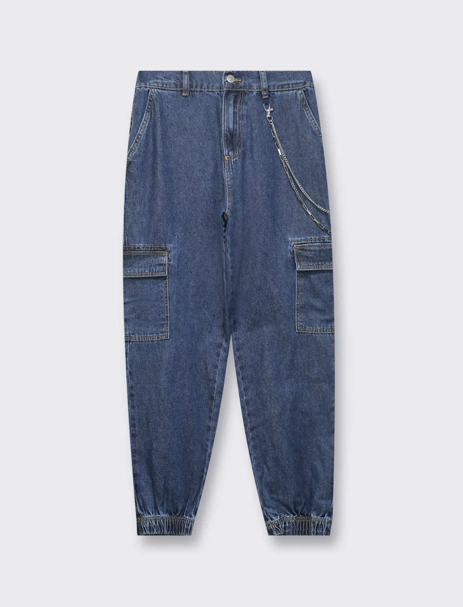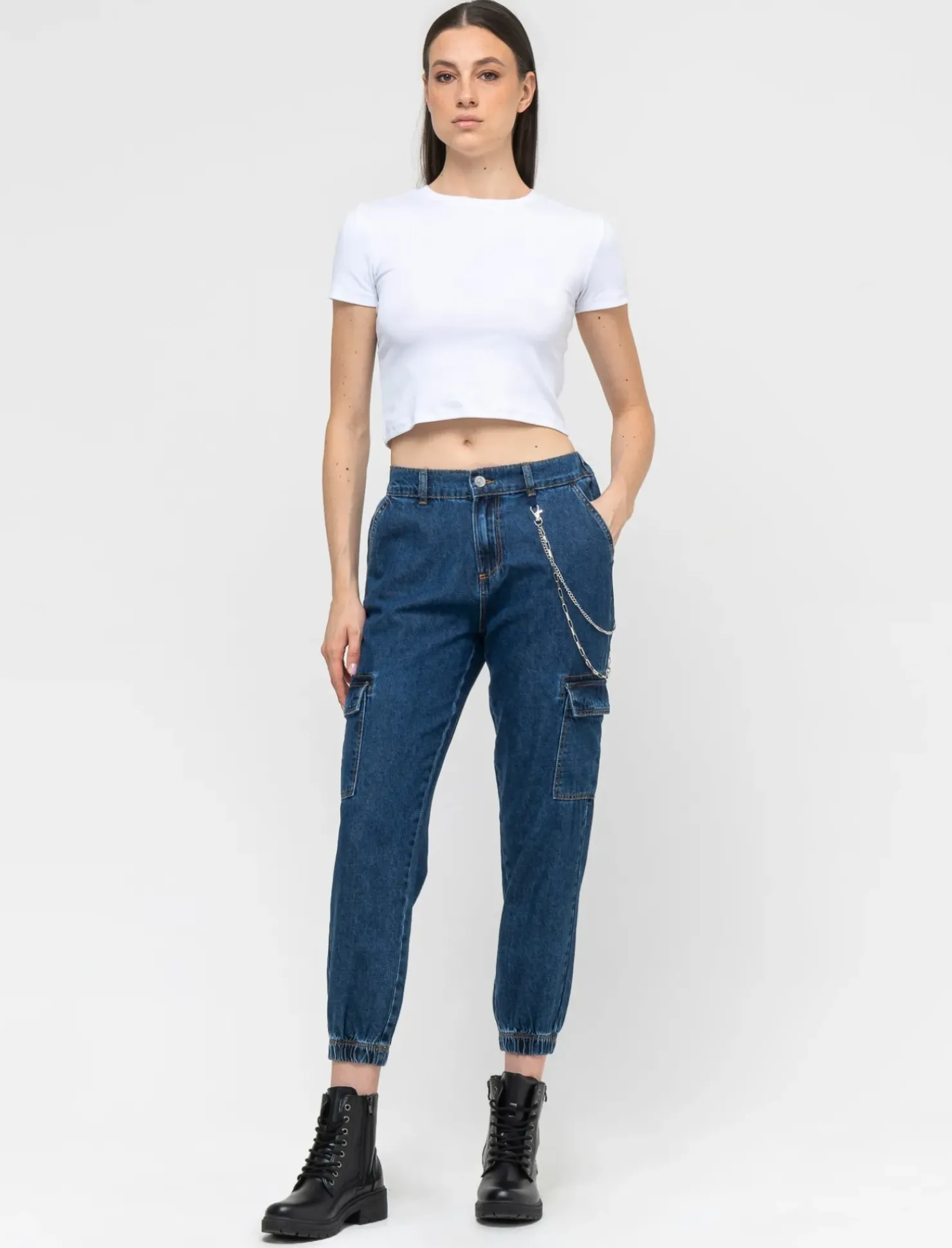 Jeans jogger con tasconi e accessorio catena, perfetti per un look casual e alla moda. Il fondo gamba con elastico assicura comodità e praticità. Ideali per un outfit versatile e trendy, da indossare in ogni occasione. Il prodotto è di colore Denim