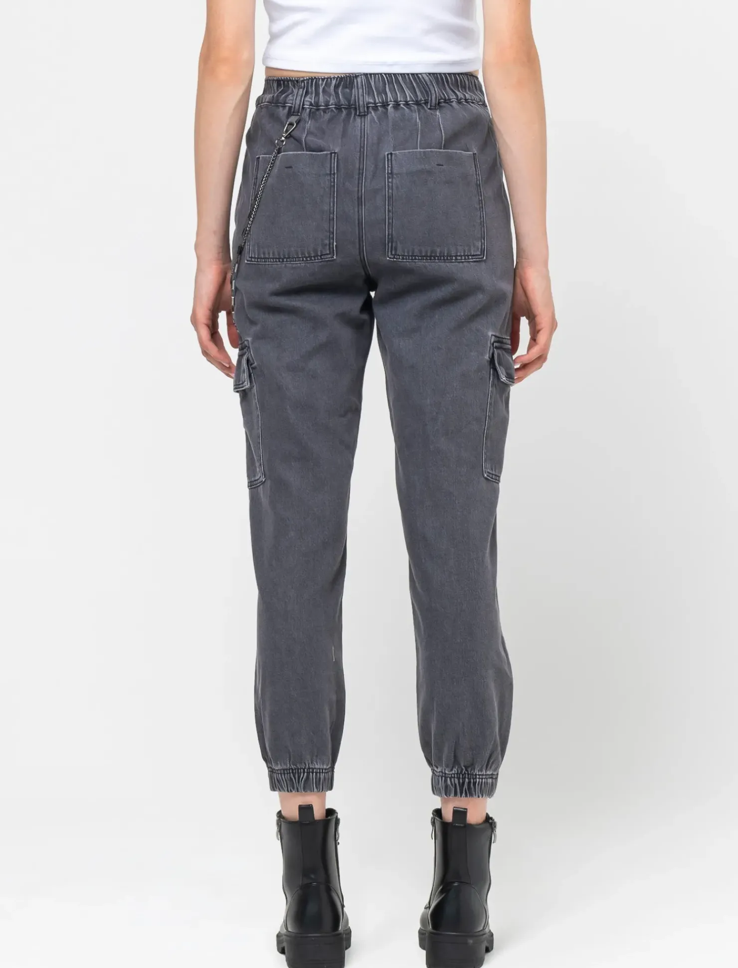 Jeans jogger con tasconi e accessorio catena, perfetti per un look casual e alla moda. Il fondo gamba con elastico assicura comodità e praticità. Ideali per un outfit versatile e trendy, da indossare in ogni occasione. Il prodotto è di colore Grigio