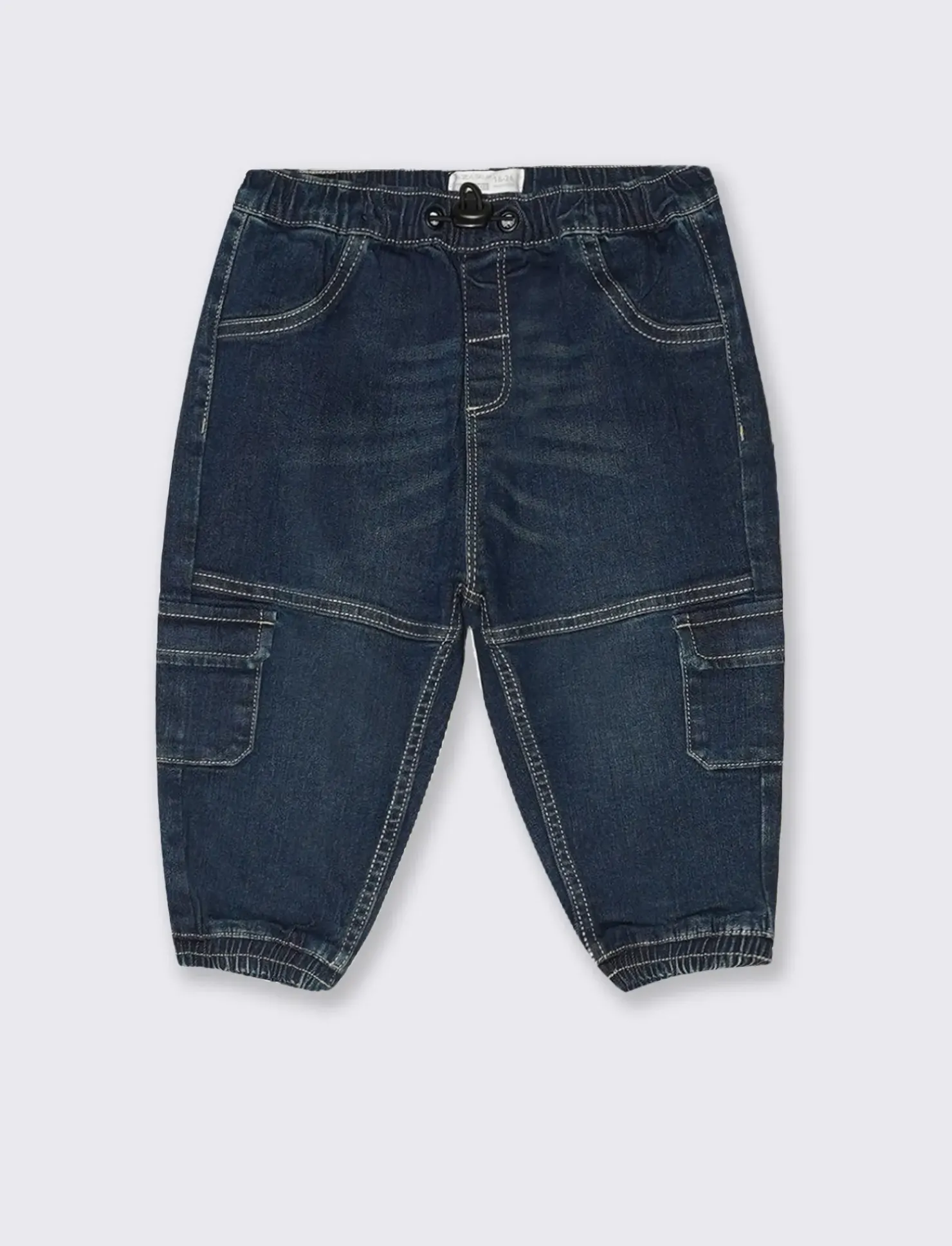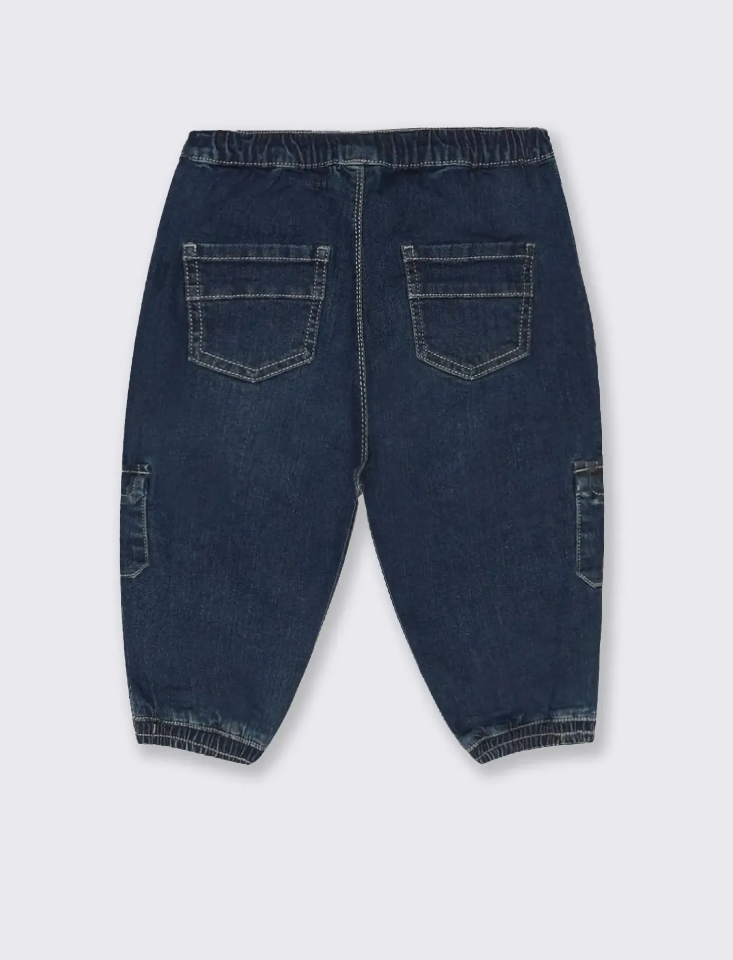 I jeans modello cargo per neonati in jeans blu scuro offrono un look moderno e pratico. Caratterizzati da elastici al fondo, garantiscono una vestibilità comoda e sicura. I tasconi laterali sono ideali per riporre piccoli oggetti, rendendoli perfetti per le avventure quotidiane dei più piccoli. Il pratico stopper frontale in plastica facilita la vestizione, assicurando che i bambini possano muoversi liberamente e con stile. Il prodotto è di colore Denim