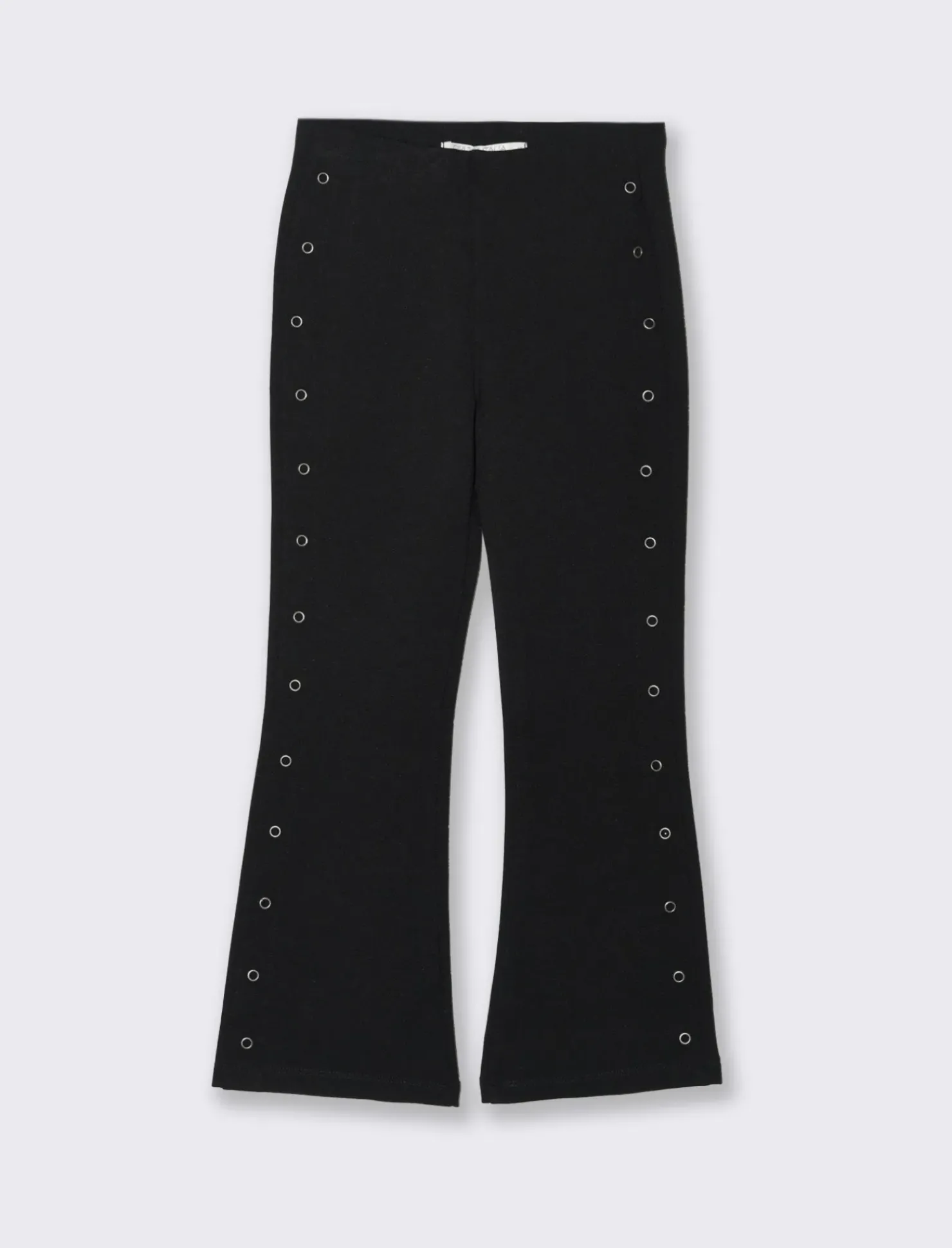 Leggings a zampa da bambina in punto milano con tagli e borchie decorative laterali Il prodotto è di colore Nero