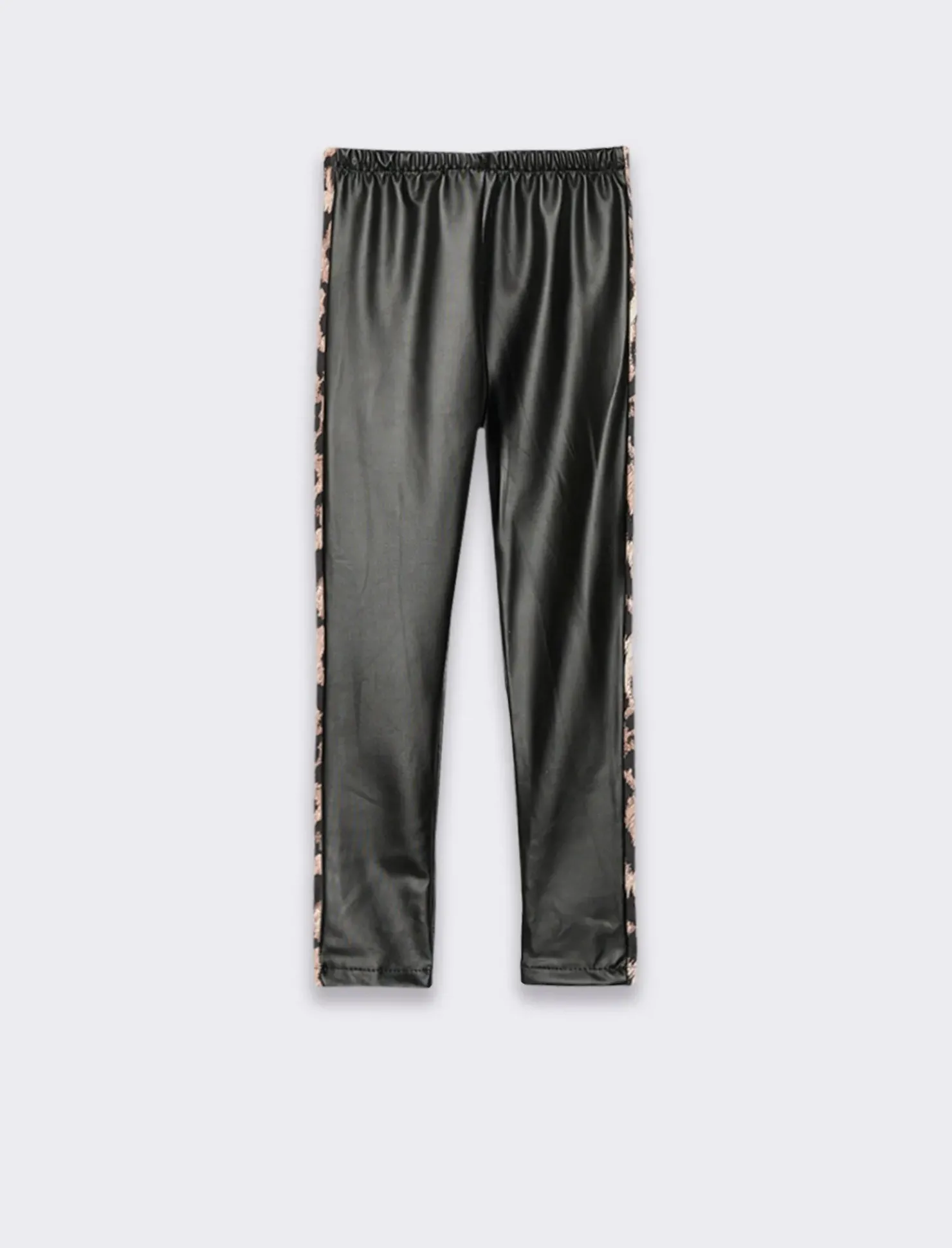 Leggings elasticizzato in finta pelle con bande laterali maculate,interno del tessuto con mano calda per garantire maggiore comfort nelle giornate fredde. Il prodotto è di colore Nero