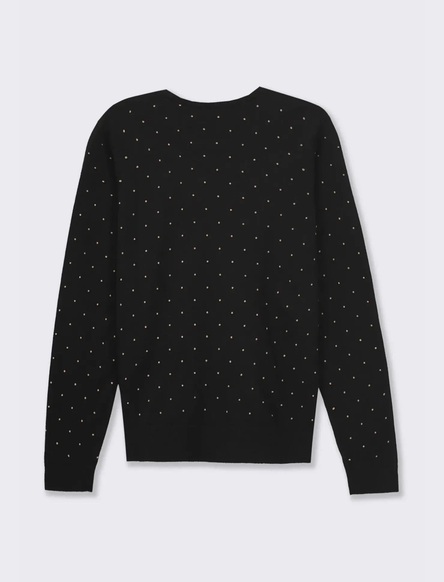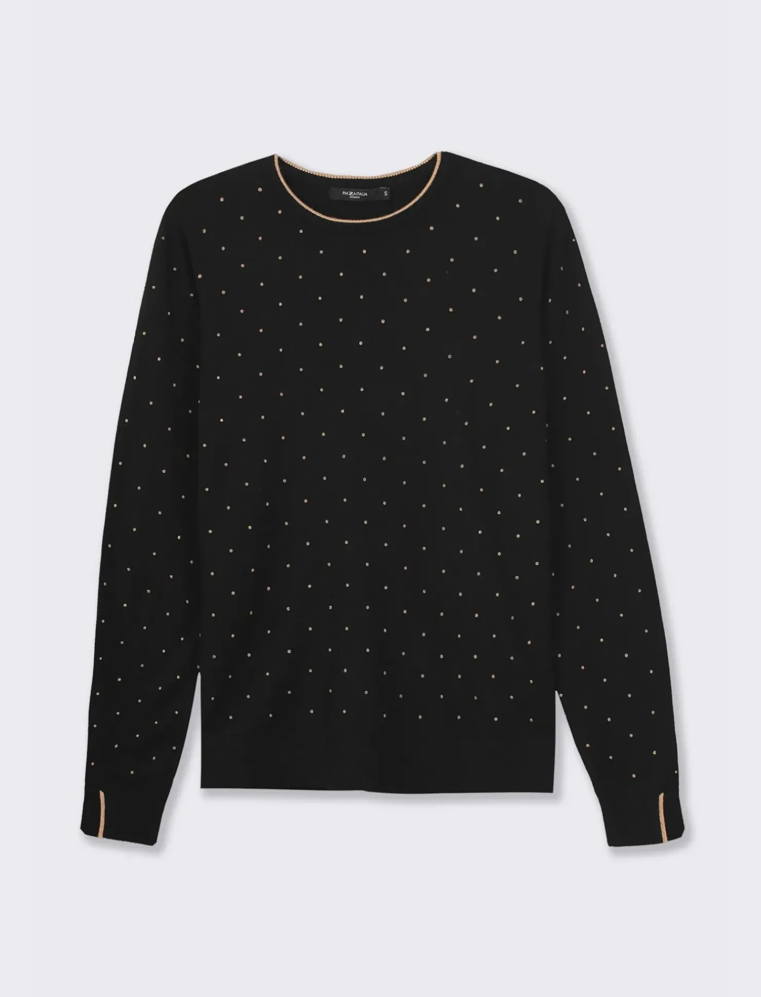 Maglia girocollo donna con motivo floccato stampato, realizzata in morbido filato per garantire comfort e stile. Disponibile in una varietà di colori vivaci e alla moda, perfetta per completare ogni outfit con un tocco di originalità e femminilità. Il prodotto è di colore Nero