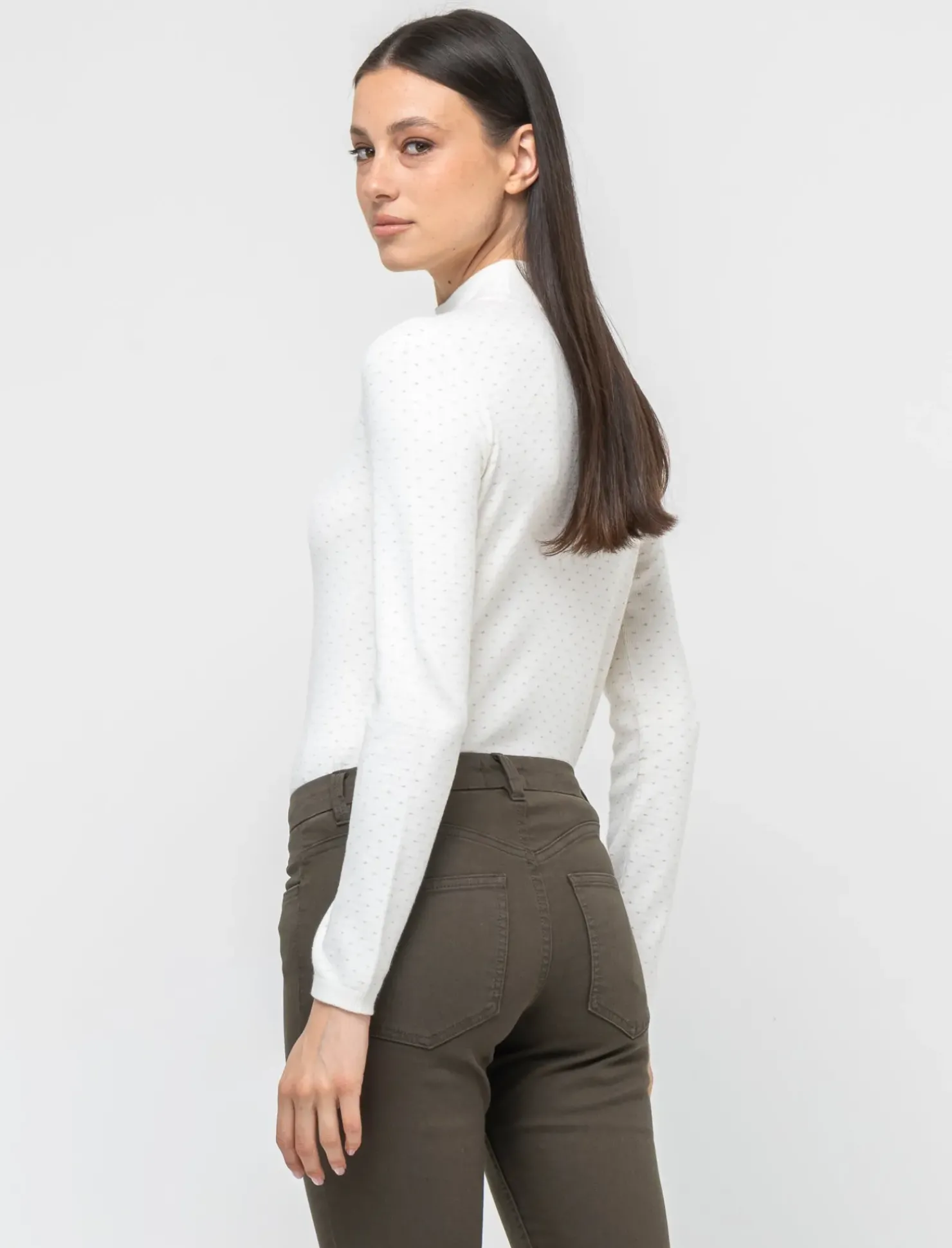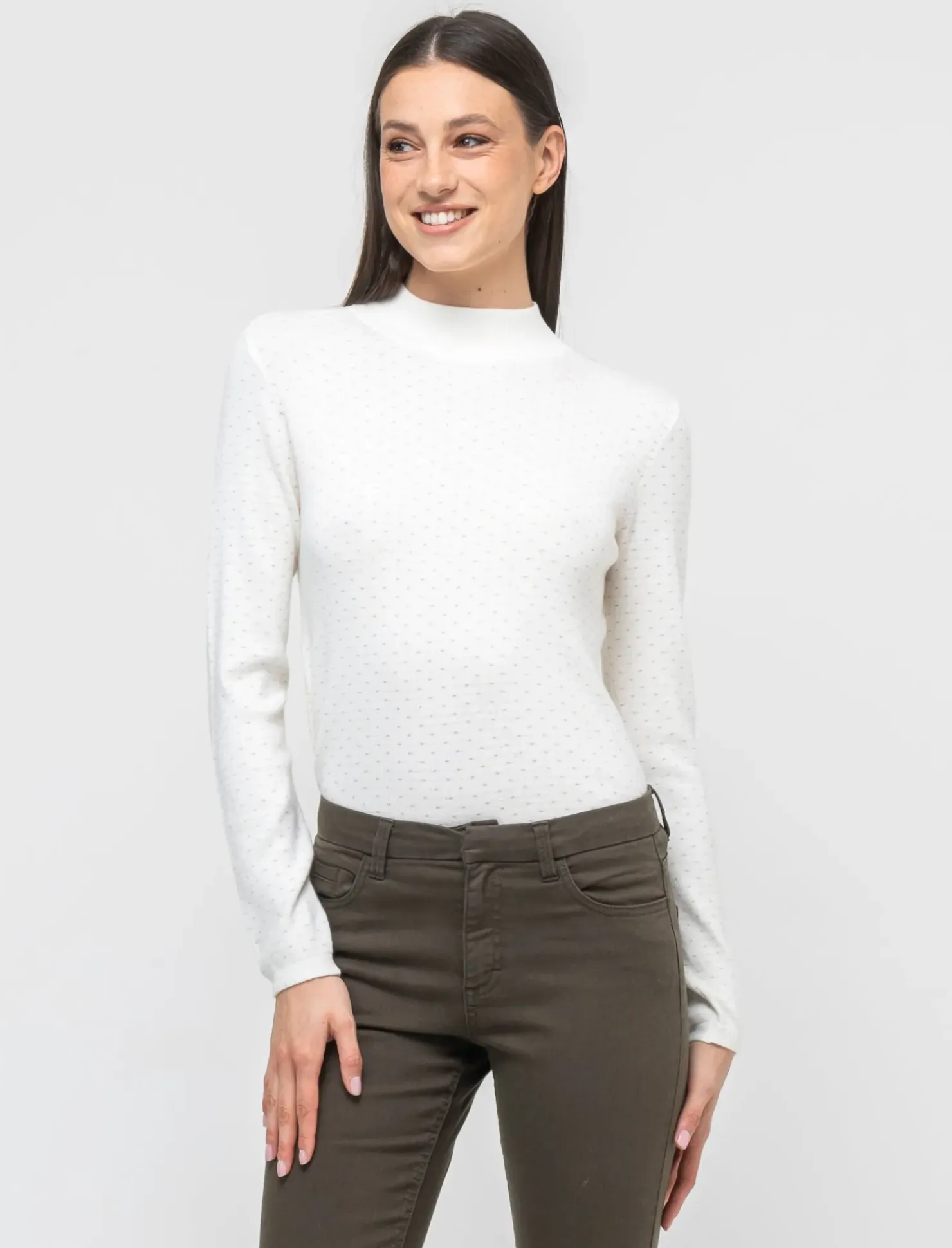 Maglia in morbido filato pensata per la donna moderna, caratterizzata da un elegante collo alto che avvolge delicatamente il collo. La sua lavorazione jacquard con effetto metallizzato dona un tocco di luminosità e raffinatezza, rendendola perfetta per ogni occasione. Disponibile in una gamma di colori, questa maglia è ideale per creare outfit versatili, dal casual al più sofisticato, senza rinunciare al comfort e allo stile. Il prodotto è di colore Avorio