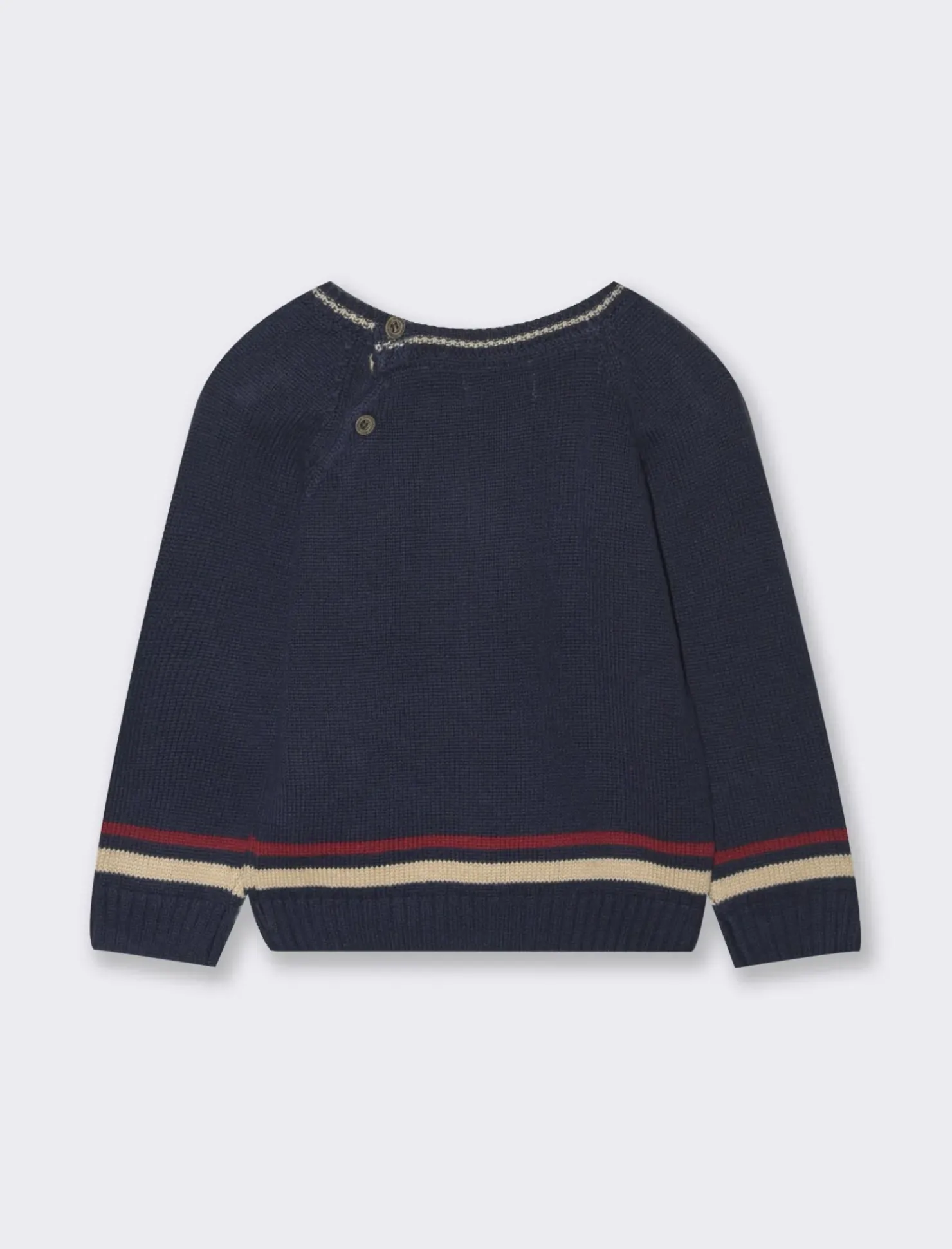 Maglia girocollo per neonato realizzata in morbido cotone e acrilico, perfetta per tenere al caldo i più piccoli. Le righe jacquard in contrasto e il patch stile varsity la rendono un capo trendy e divertente, ideale per completare il guardaroba dei bambini con stile e comfort. Il prodotto è di colore Blu