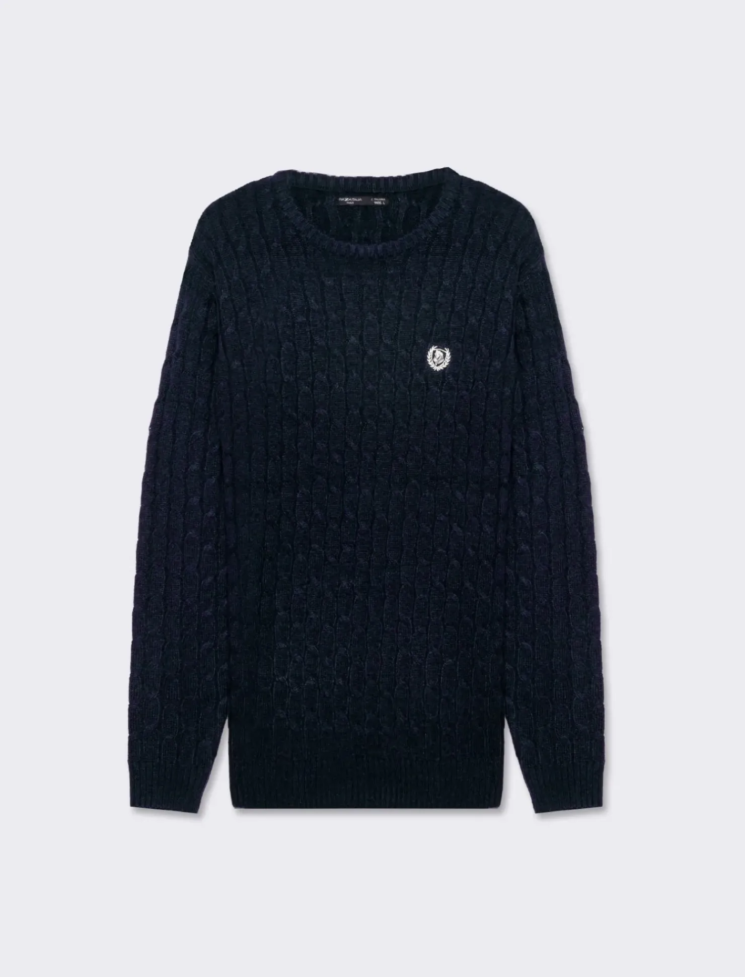 Maglia collo alto a trecce, un capo versatile e raffinato per l’uomo moderno. La lavorazione a trecce conferisce un tocco di eleganza, mentre il dolcevita offre calore e comfort nelle giornate più fresche. Il ricamo sul petto aggiunge un dettaglio distintivo, rendendo questa maglia perfetta per ogni occasione, dal lavoro al tempo libero. Le costine al collo, ai polsi e al fondo assicurano una vestibilità regolare, valorizzando la silhouette maschile. Il prodotto è di colore Blu