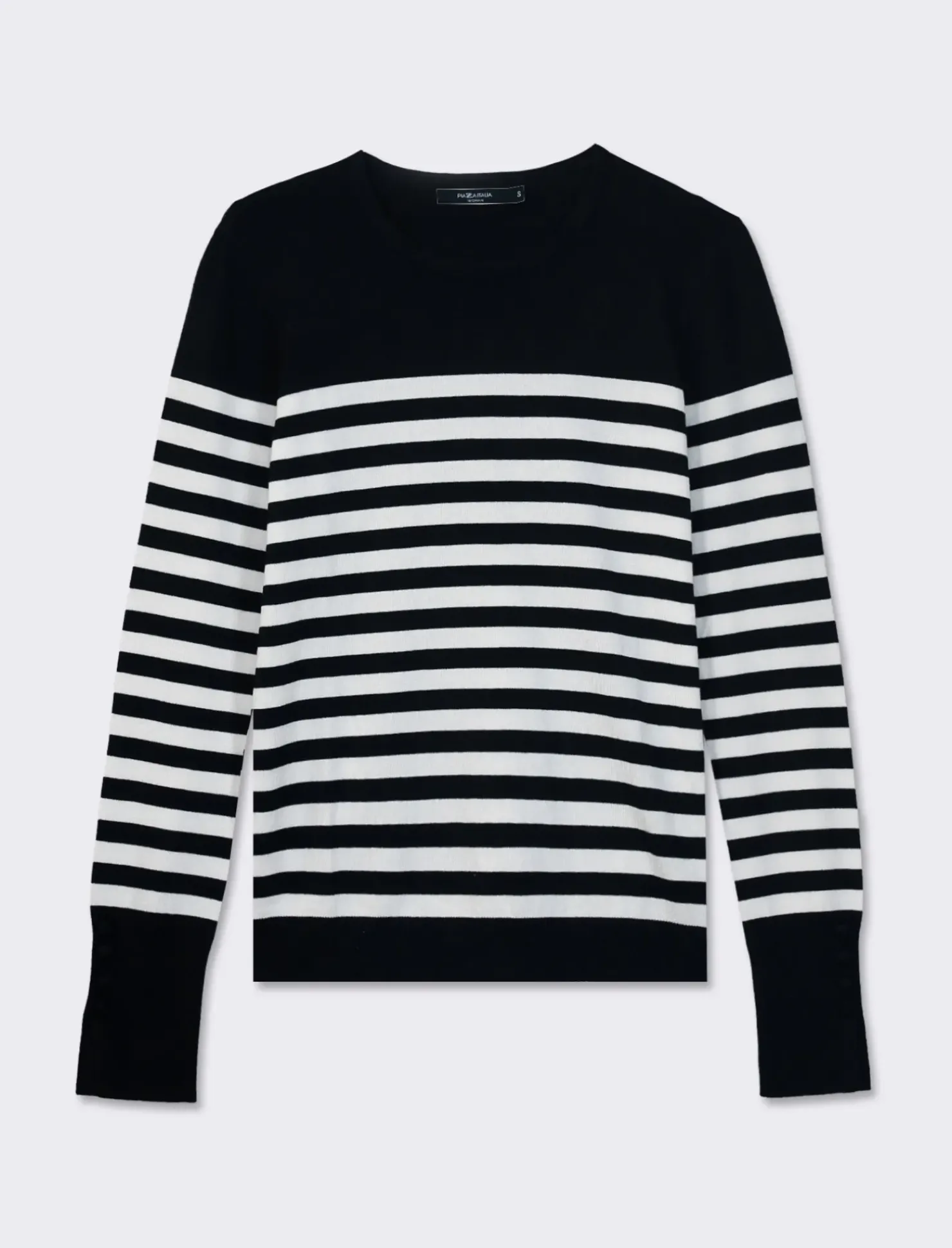 Maglia girocollo a righe per donna realizzata in morbida maglia fine di viscosa. Il motivo a righe conferisce un tocco di eleganza e modernità, mentre i dettagli dei bottoni sul polso aggiungono un tocco di originalità. La lavorazione con filo effetto metallo dona luminosità al capo, perfetto per un look casual chic. Il prodotto è di colore var 1