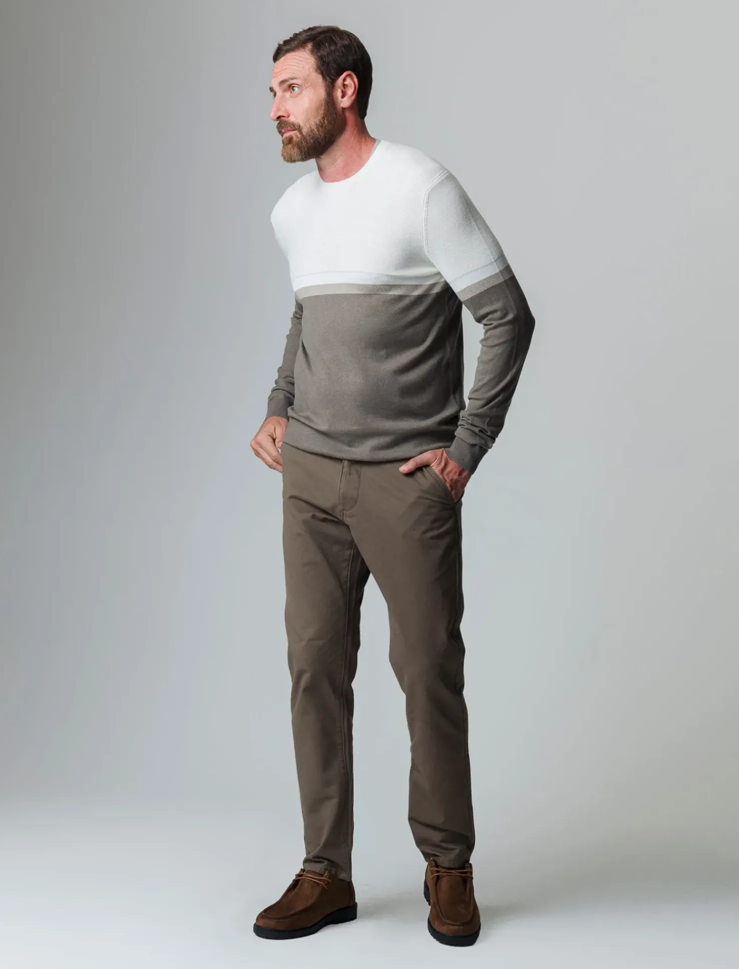 Maglia girocollo a fasce, un capo versatile e di tendenza per l’uomo moderno. Realizzata con una raffinata lavorazione jacquard, presenta una fantasia a fasce che aggiunge un tocco di originalità al tuo guardaroba. Il taglio regular fit garantisce una vestibilità comoda, mentre la costina al collo, ai polsi e al fondo conferisce un aspetto curato e raffinato. Perfetta per un look casual o per occasioni più formali, questa maglia è un must-have per ogni stagione. Il prodotto è di colore Grigio fango