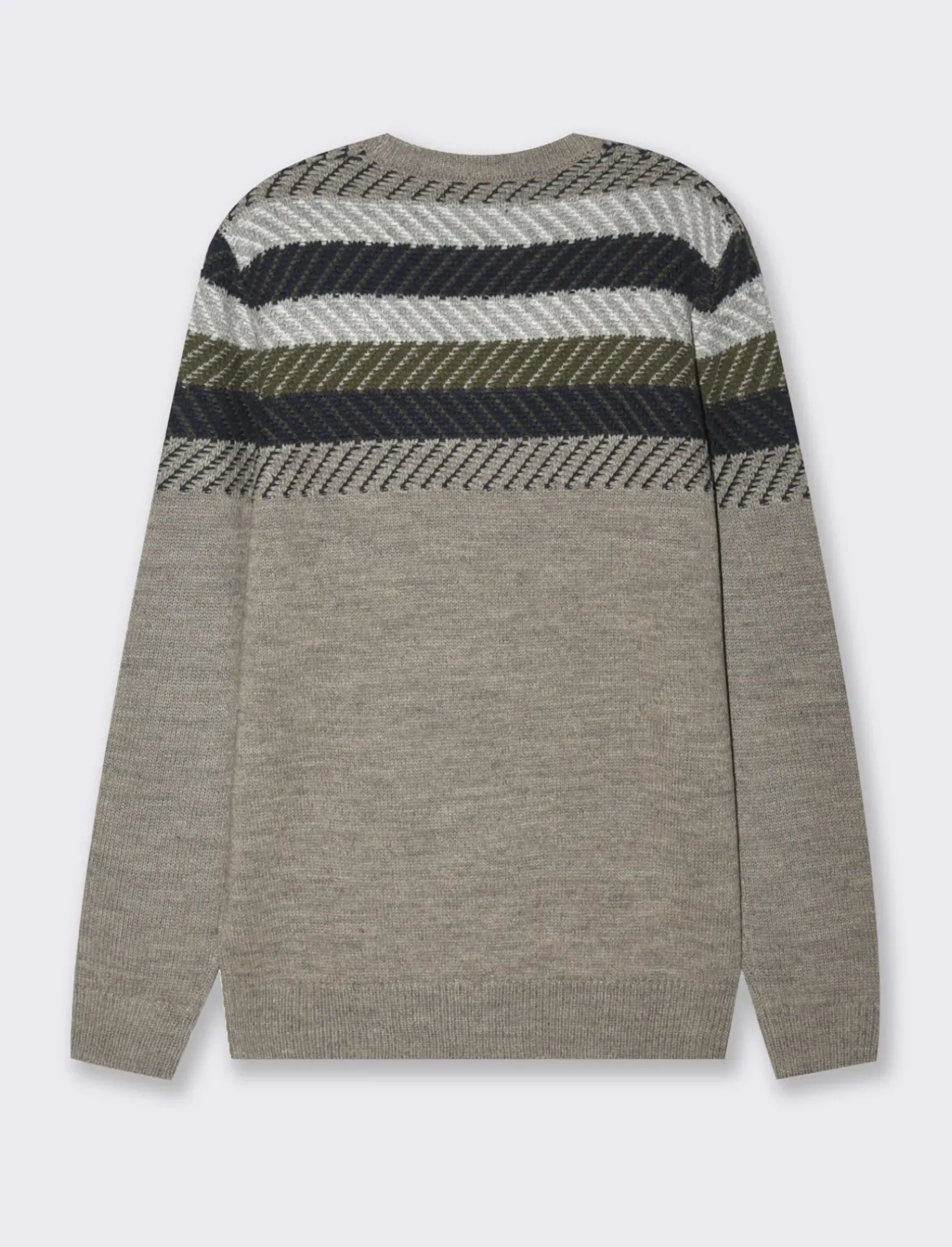 Maglia girocollo in pregiata lavorazione jacquard, caratterizzata da una raffinata fantasia a righe strutturate. Il suo taglio regular fit offre una vestibilità comoda e versatile, ideale per ogni occasione. La costina al collo, ai polsi e al fondo conferisce un tocco di eleganza e definizione, rendendo questo capo perfetto per un look casual ma curato. Un must-have nel guardaroba maschile, per chi ama distinguersi con stile. Il prodotto è di colore Grigio fango