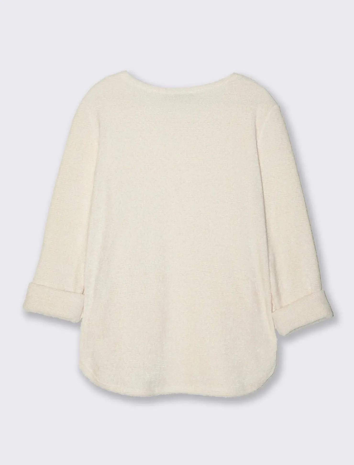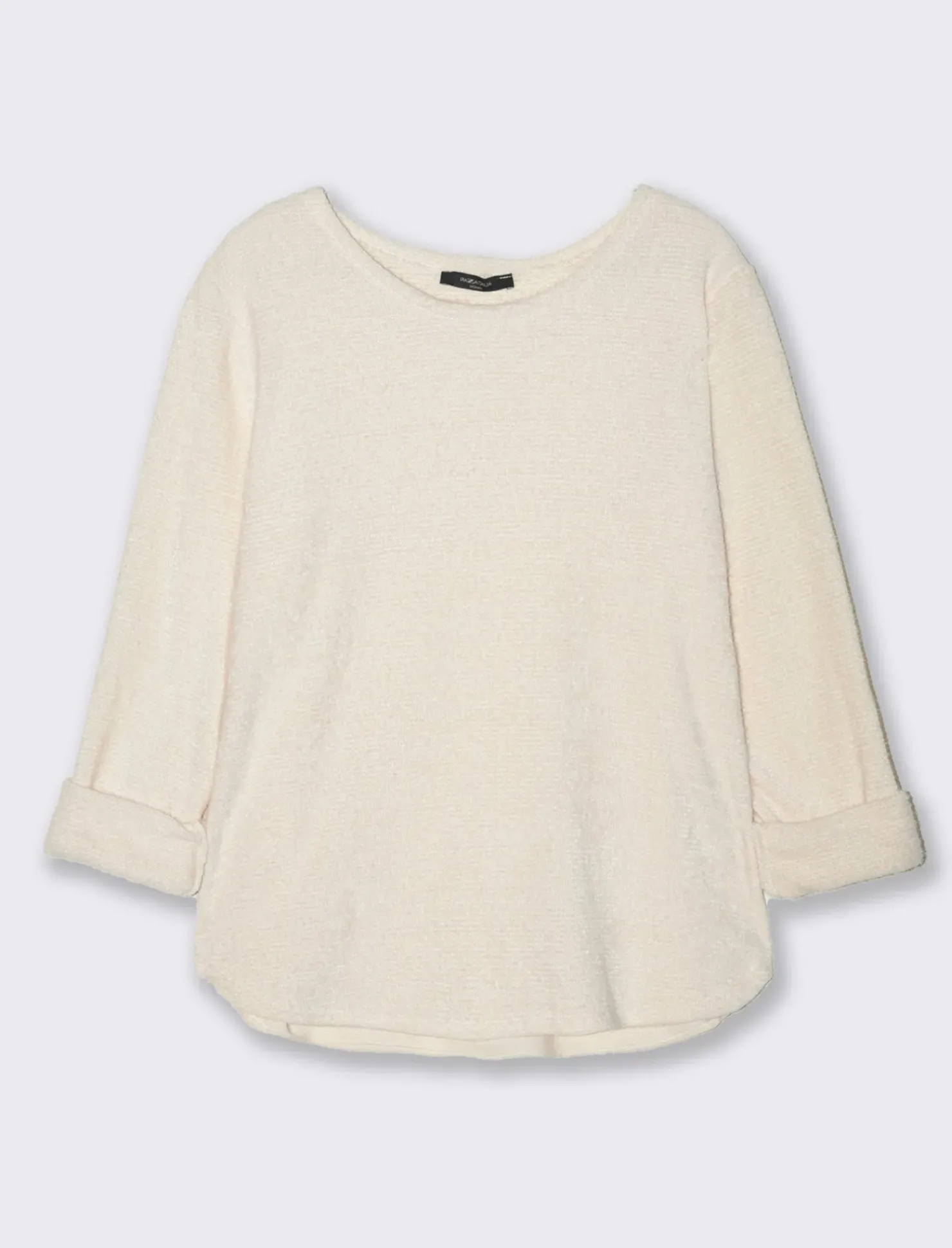 Maglia in filato effetto peluche tinta unita; scollo a barca; maniche lunghe. Il prodotto è di colore Bianco