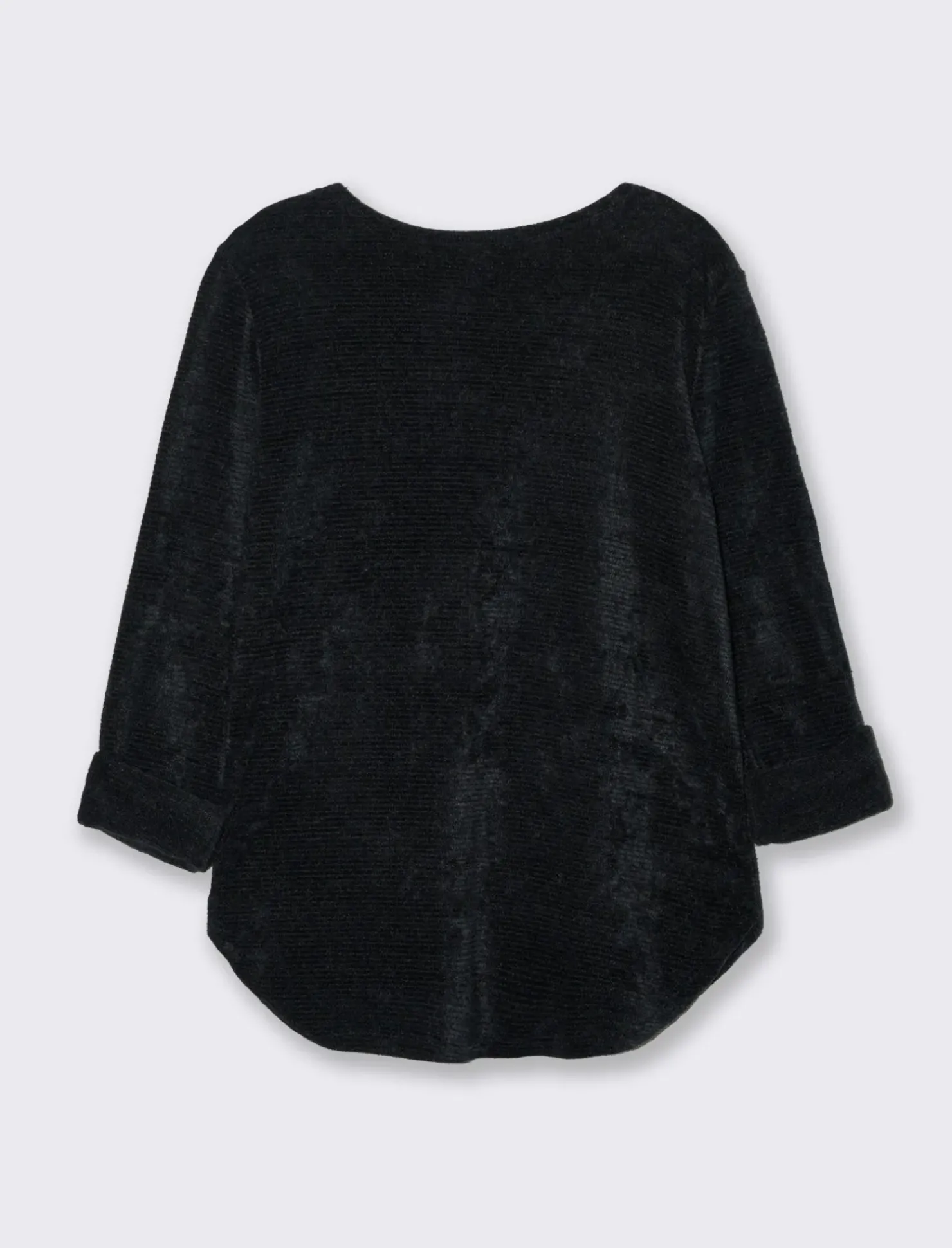 Maglia in filato effetto peluche tinta unita; scollo a barca; maniche lunghe. Il prodotto è di colore Nero