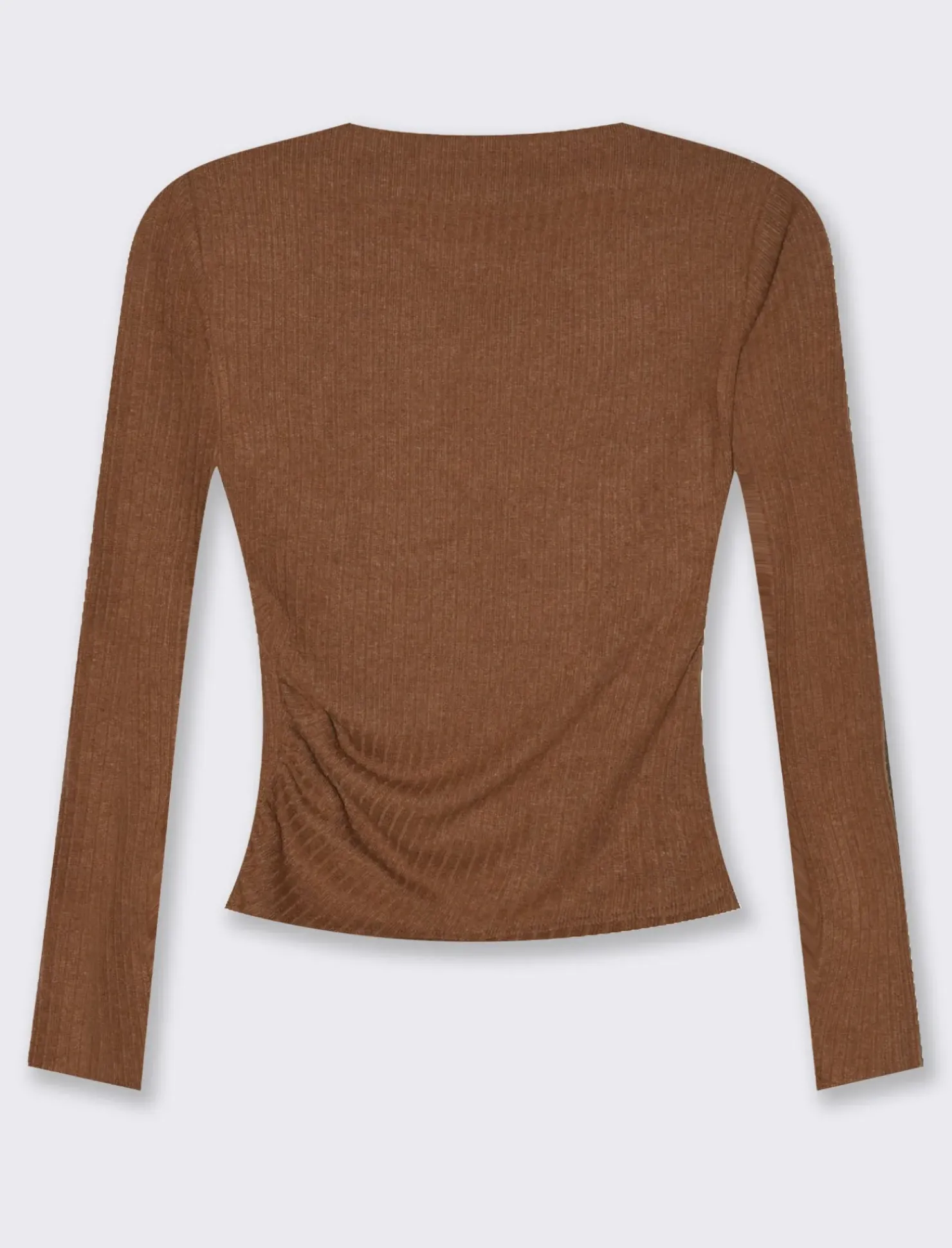 Realizzata in un tessuto stretch, questa maglia si adatta perfettamente alle forme del corpo, garantendo una vestibilità aderente ma confortevole. Lo scollo a barca aggiunge un tocco di raffinatezza, mettendo in risalto le spalle e il collo in modo delicato. Il tessuto è morbido al tatto e leggermente elasticizzato, permettendo libertà di movimento senza rinunciare allo stile. Le maniche lunghe offrono una copertura ideale per le giornate più fresche, mentre il design semplice e pulito rende questa maglia estremamente versatile. Può essere indossata sia con jeans per un look casual che con una gonna o pantaloni eleganti per un’occasione più formale. Il prodotto è di colore Cammello
