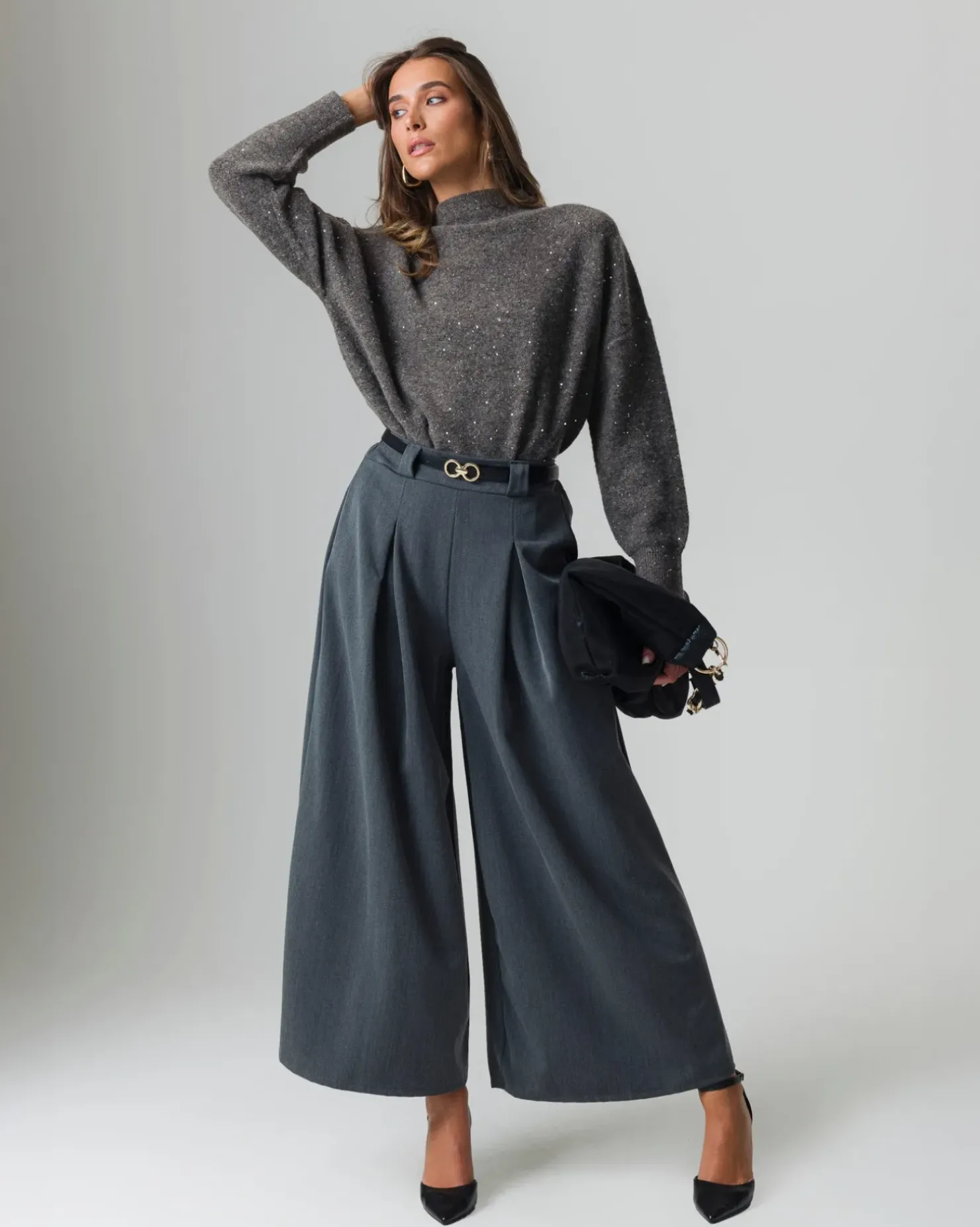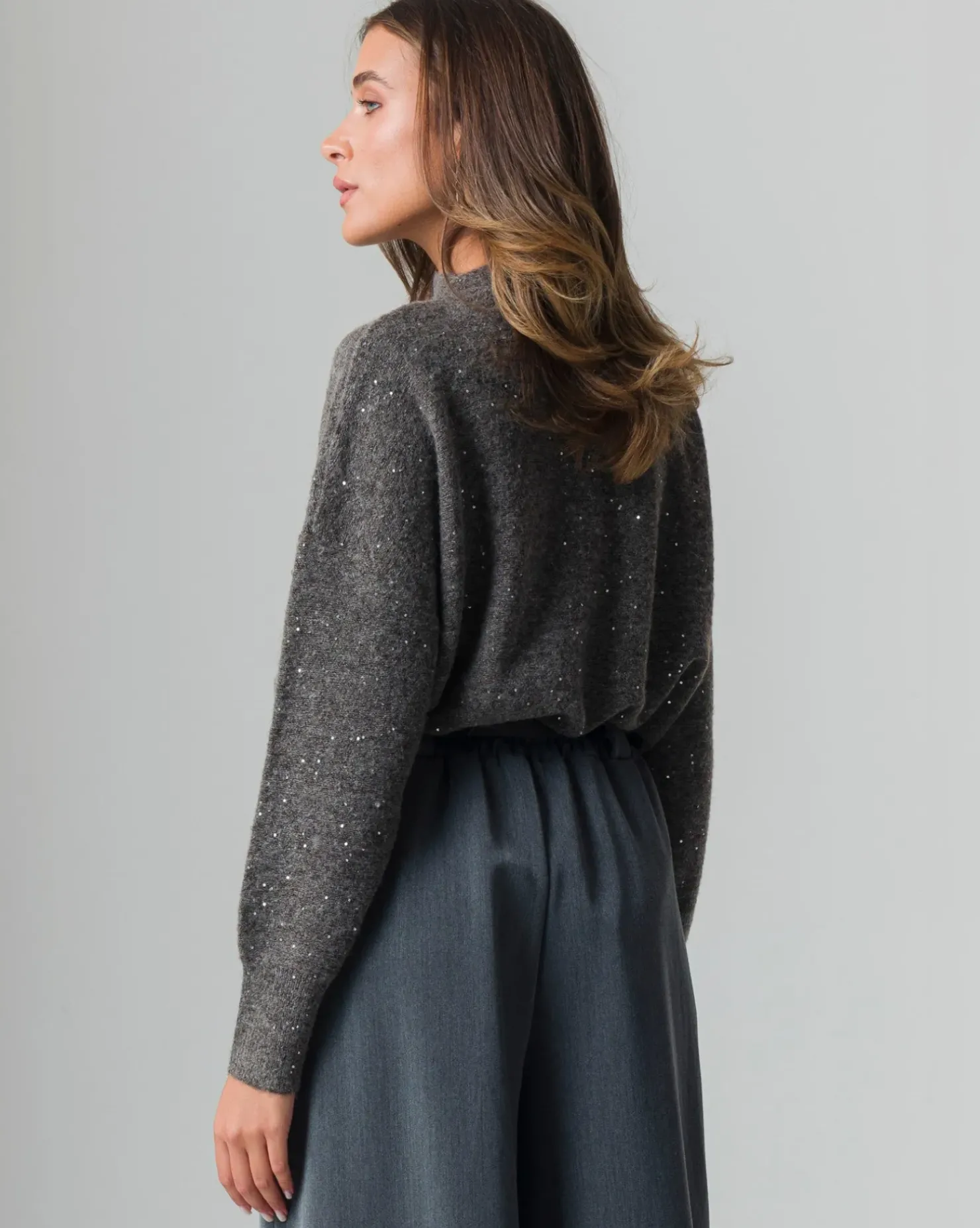 La maglia mezzocollo manica lunga per donna è un capo elegante e versatile, realizzata con un filato di paillates che cattura la luce in modo raffinato. Gli spacchi laterali donano un tocco di modernità, mentre i polsi e il fondo a costa elastica garantiscono una vestibilità confortevole. Ideale per creare look sofisticati, si presta a molteplici abbinamenti, rendendo ogni outfit unico e di tendenza. Il prodotto è di colore Grigio melange