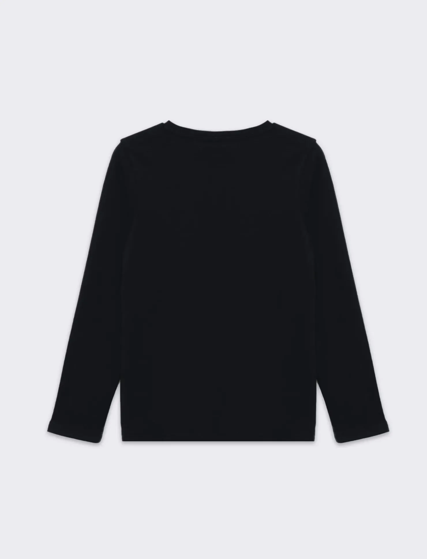T-shirt per bambina con maniche lunghe, realizzata al 100% in morbido cotone. La maglietta presenta una stampa colorata e brillante sul davanti, perfetta per aggiungere un tocco di allegria al guardaroba delle più piccole. Il prodotto è di colore Nero
