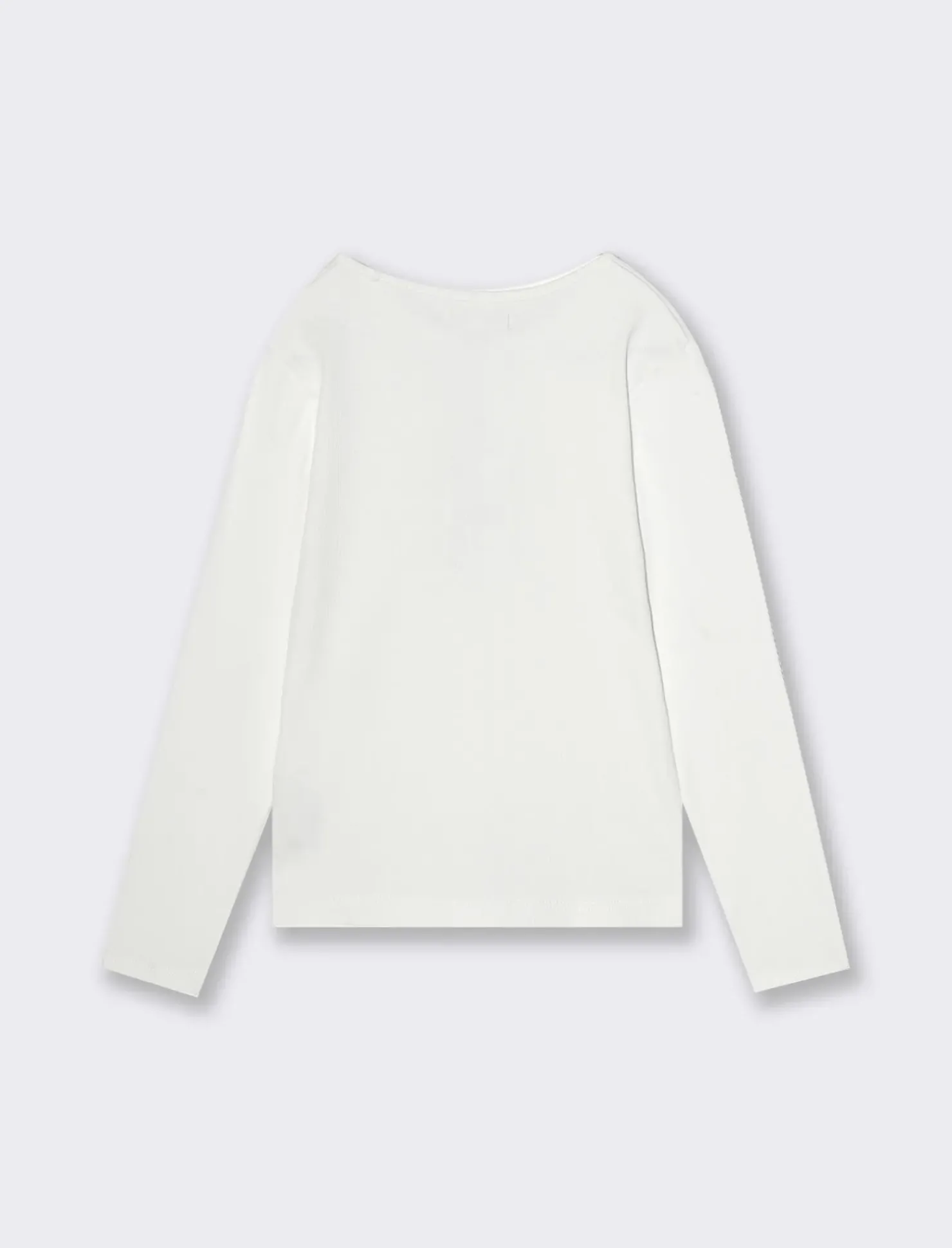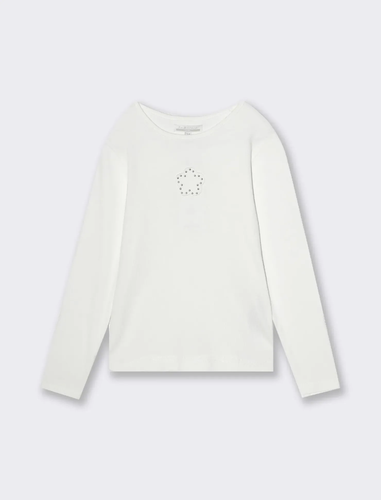 T-shirt in costina per bambina, perfetta per un look casual e alla moda. Realizzata in morbido cotone elastico, con maniche lunghe e dettagli patch con borchie sul davanti. Un capo comodo e trendy, ideale per le giornate all’aria aperta o per un’uscita con gli amici. Il prodotto è di colore Bianco sporco