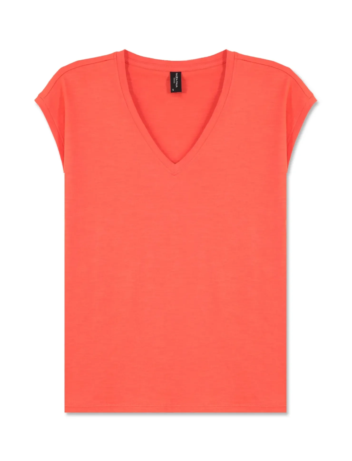 Maglietta perfetta per ogni occasione, dal look casual a quello più elegante. Realizzata in morbido tessuto slub di cotone, garantisce comfort e stile. Il taglio scollo a V valorizza il décolleté femminile, mentre le maniche corte la rendono adatta alla stagione estiva. Il prodotto è di colore Corallo
