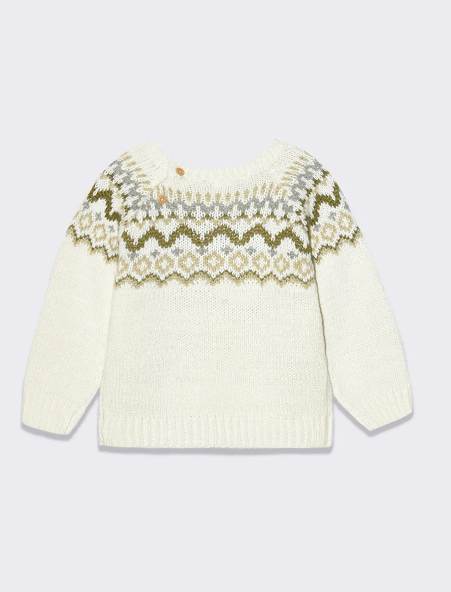 Maglioncino neonato in morbido acrilico, perfetto per proteggere i più piccoli nelle fredde mattine invernali. Con un grazioso intarsio frontale e una comoda abbottonatura posteriore, questo maglioncino è un must-have per il guardaroba dei bambini. Confortevole e caldo, sarà il compagno ideale per le giornate più fresche. Il prodotto è di colore Bianco panna