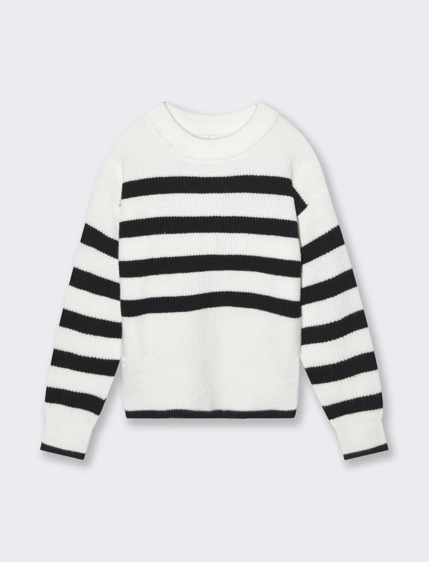 Maglione a righe per bambina realizzato in morbida poliviscosa, ideale per tenere al caldo le più piccole durante le giornate più fresche. Con il suo design a righe colorate, questo maglione è perfetto per un look allegro e alla moda. Il prodotto è di colore Bianco sporco