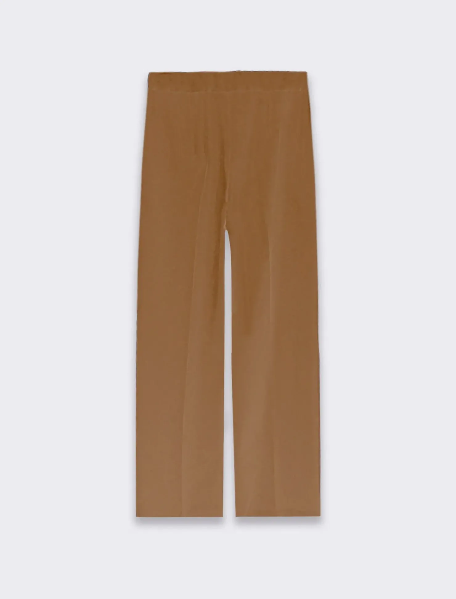 Questi pantaloni presentano una vita alta, che slancia la figura e aggiunge un tocco di raffinatezza. La chiusura con doppio bottone e zip non solo garantisce una vestibilità sicura, ma aggiunge anche un dettaglio stilistico interessante. Sul retro, un elastico in vita assicura un comfort ottimale, adattandosi perfettamente alla forma del corpo senza stringere. Questo dettaglio rende i pantaloni ideali per essere indossati tutto il giorno, mantenendo sempre una sensazione di comodità. Le tasche americane davanti offrono praticità e un tocco casual. Questi pantaloni sono versatili e possono essere abbinati a una camicia elegante per un look da ufficio Il prodotto è di colore Marrone tabacco