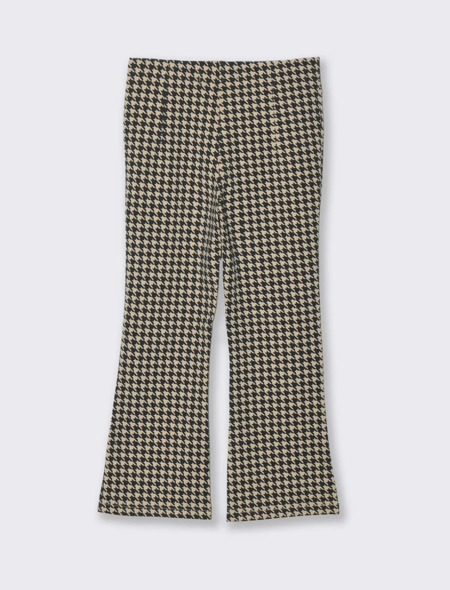 Pantaloni stampati da bambina pie de poule beige e nero con fondo svasato e spacchetti laterali. Tasche alla francese e bottoni decorativi sul davanti. Il prodotto è di colore Fantasia