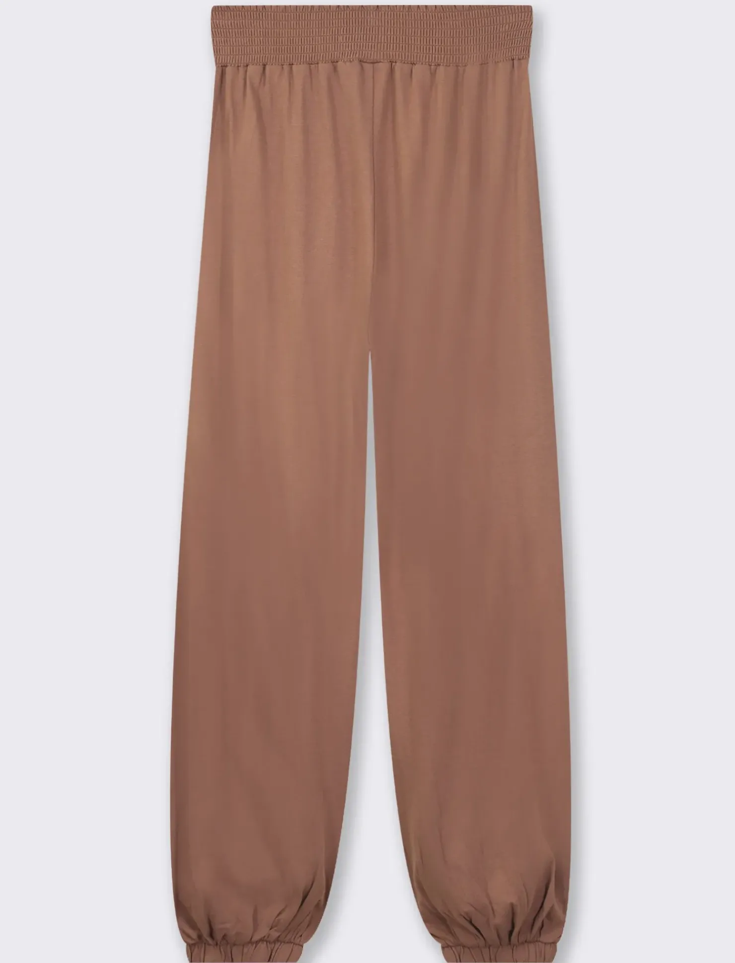 Pantalone alla turca in cotone leggero per un look casual e chic. Il bustino arricciato sul davanti e il ricamo punto smoke sul dietro aggiungono un tocco di originalità. Il fondo con elastico offre comfort e praticità. Ideale per un outfit estivo dallo stile unico ed elegante. Perfetto per valorizzare la femminilità in ogni occasione. Il prodotto è di colore Cacao