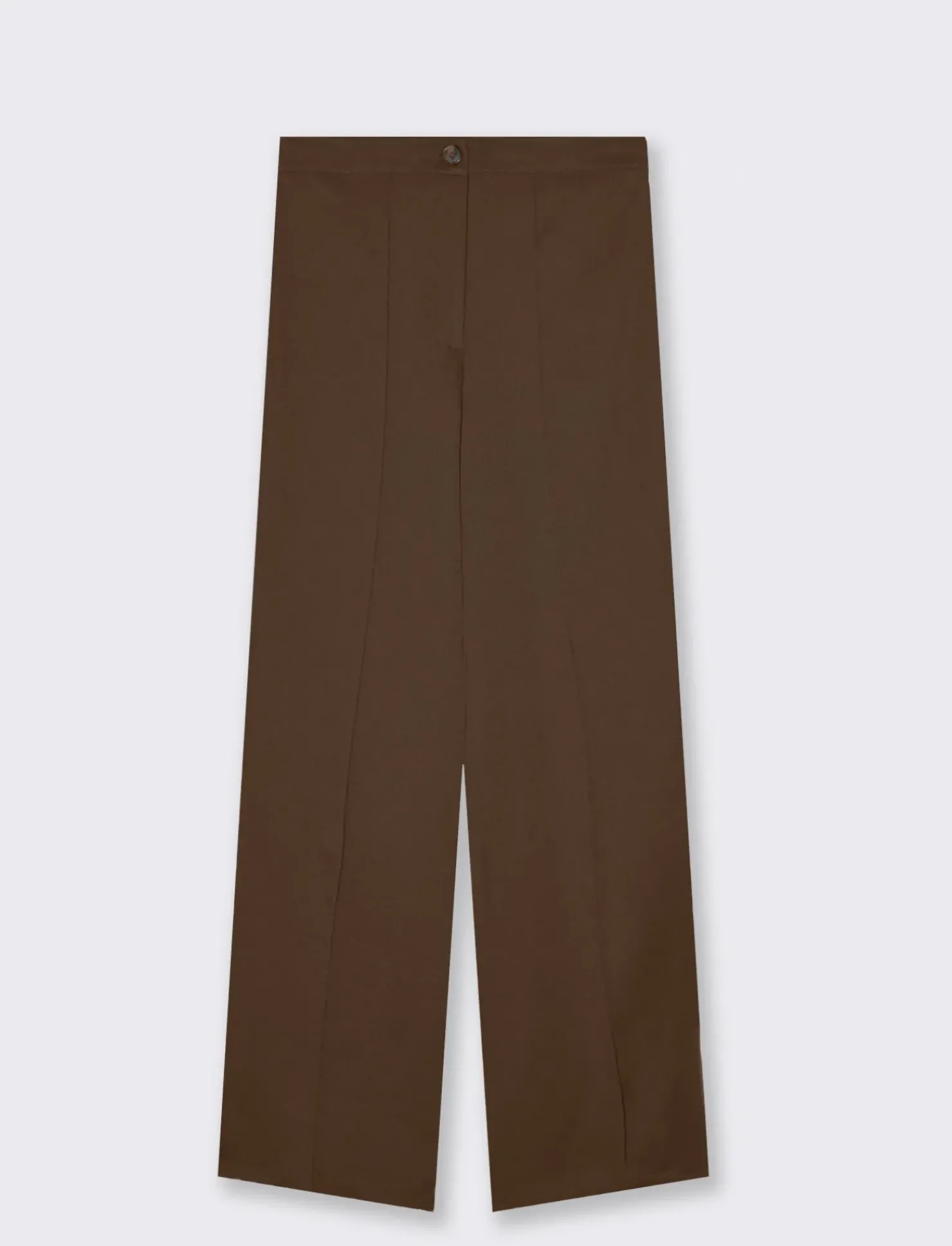 Pantaloni eleganti e moderni, caratterizzati da una chiusura con zip e bottone sulla parte anteriore, che offre un aspetto pulito e sofisticato. La cucitura in rilievo che corre lungo tutta la lunghezza del pantalone aggiunge un dettaglio distintivo e raffinato, creando un effetto visivo che allunga e slancia la figura. Realizzati in un tessuto di alta qualità, questi pantaloni combinano stile e comfort, rendendoli ideali per diverse occasioni, sia formali che casual. Il prodotto è di colore Marrone tabacco