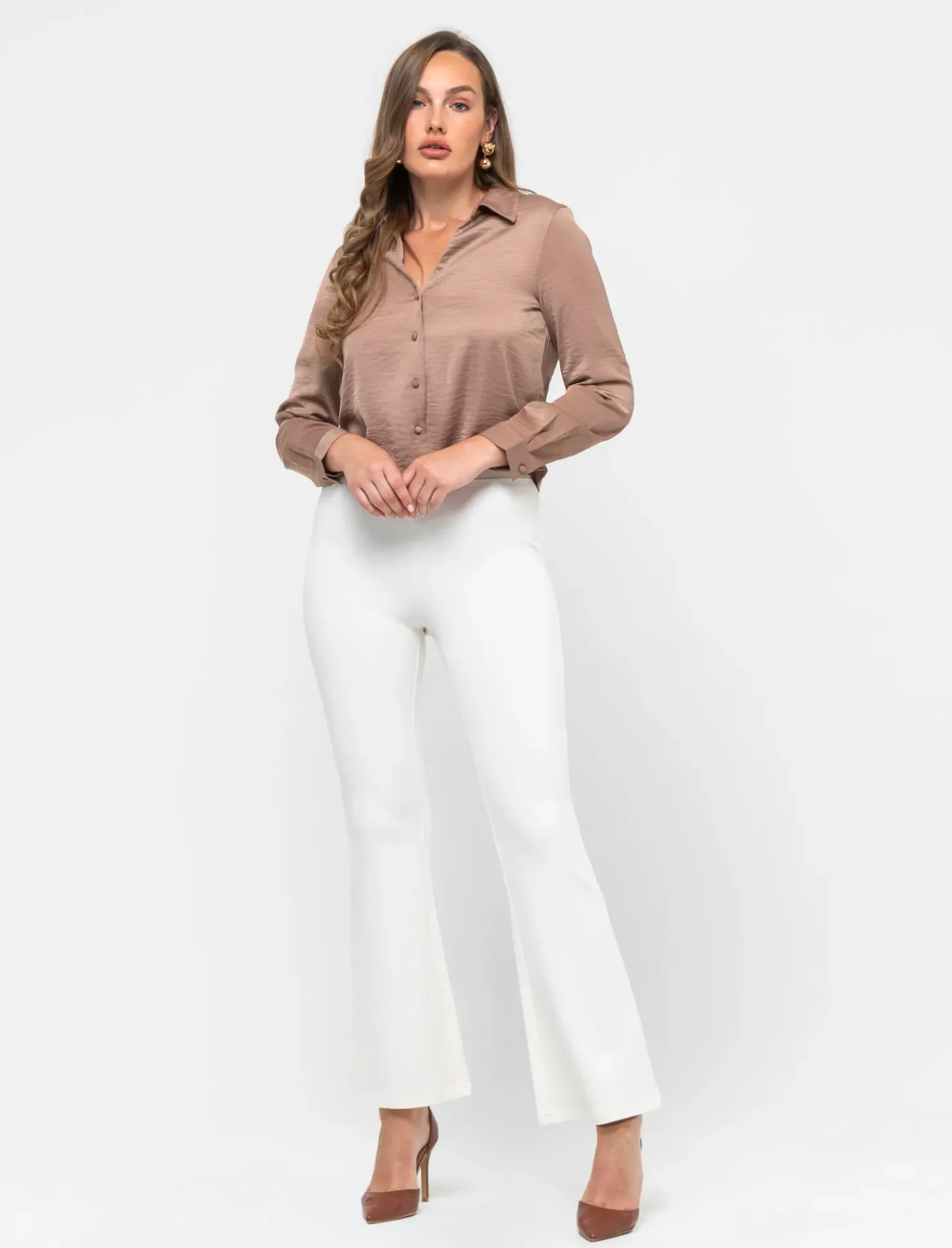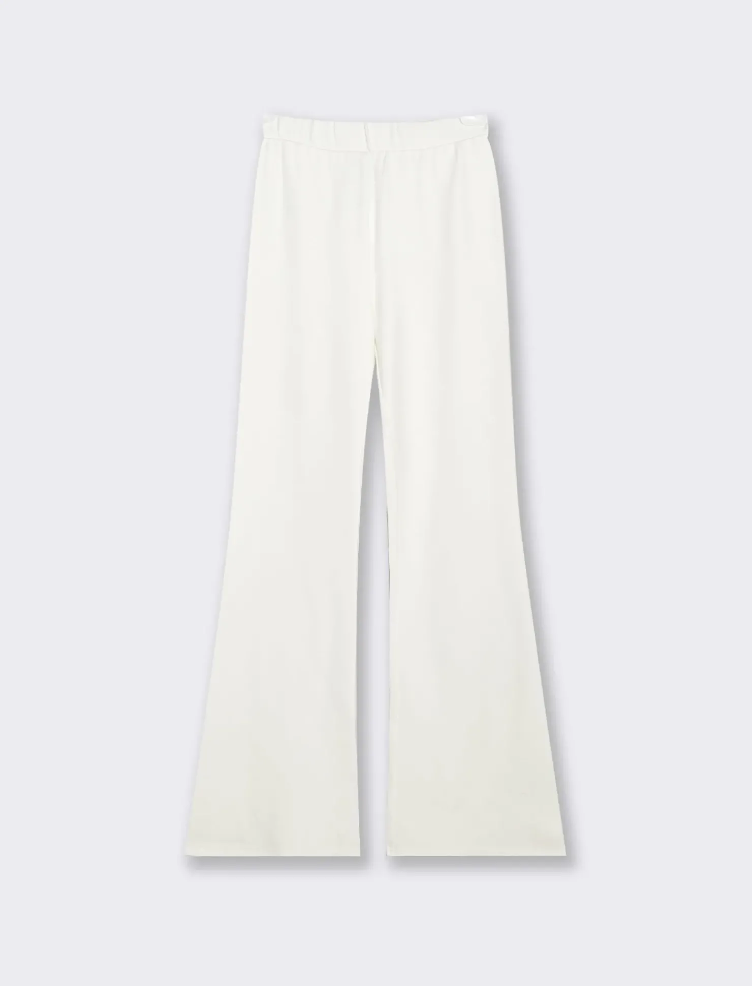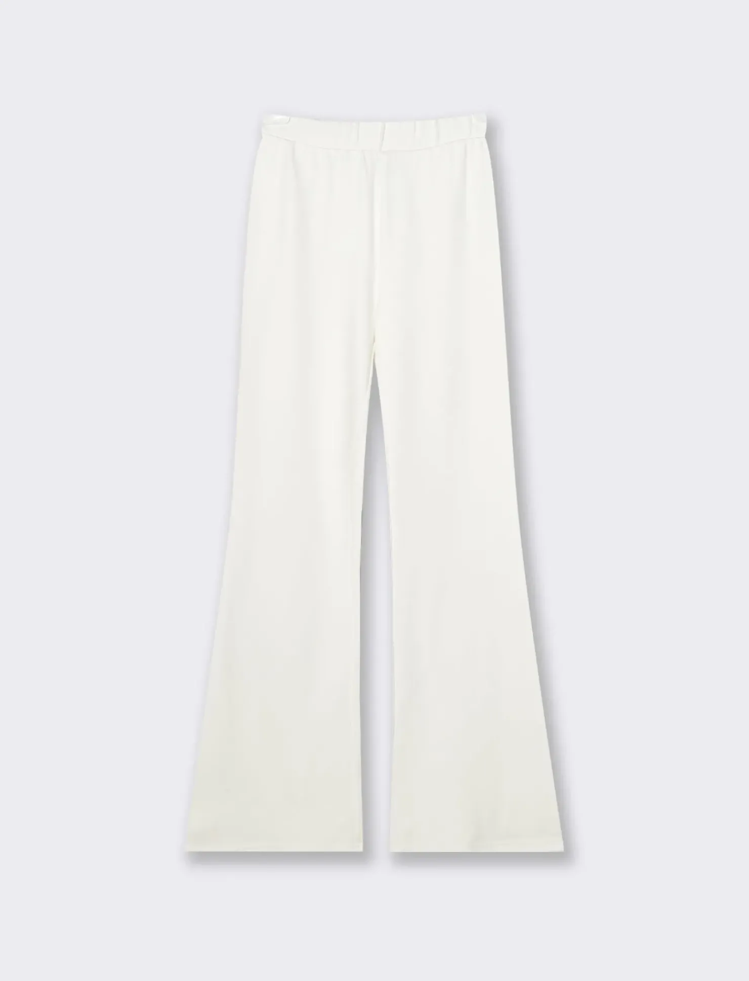 Pantalone flare donna in punto milano con bustino elastico. Un capo versatile e di tendenza, perfetto per un look casual ma sofisticato. La vestibilità ampia e la linea svasata donano un tocco di eleganza e femminilità. Ideale da indossare in ogni occasione, dalla giornata in ufficio al cocktail serale con amici. Il prodotto è di colore Avorio