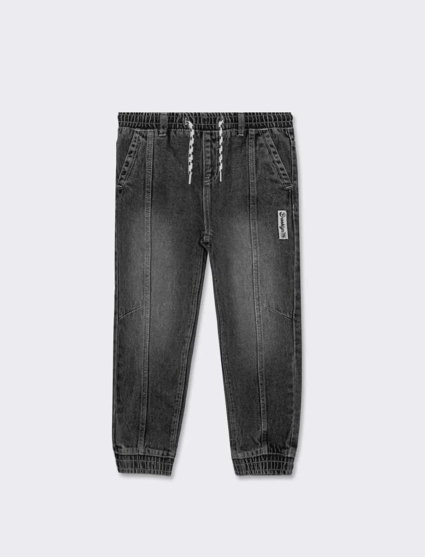 Pantalone in denim modello jogger, caratterizzato da un design moderno e versatile. I lacci in vita permettono una vestibilità personalizzata, mentre la stampa sul retro aggiunge un tocco di originalità. Ideale per un look casual e informale, questo pantalone è perfetto per affrontare le giornate con comfort e stile. La combinazione di praticità e tendenze rende questo jogger un must-have nel guardaroba di chi ama la moda contemporanea. Il prodotto è di colore Grigio